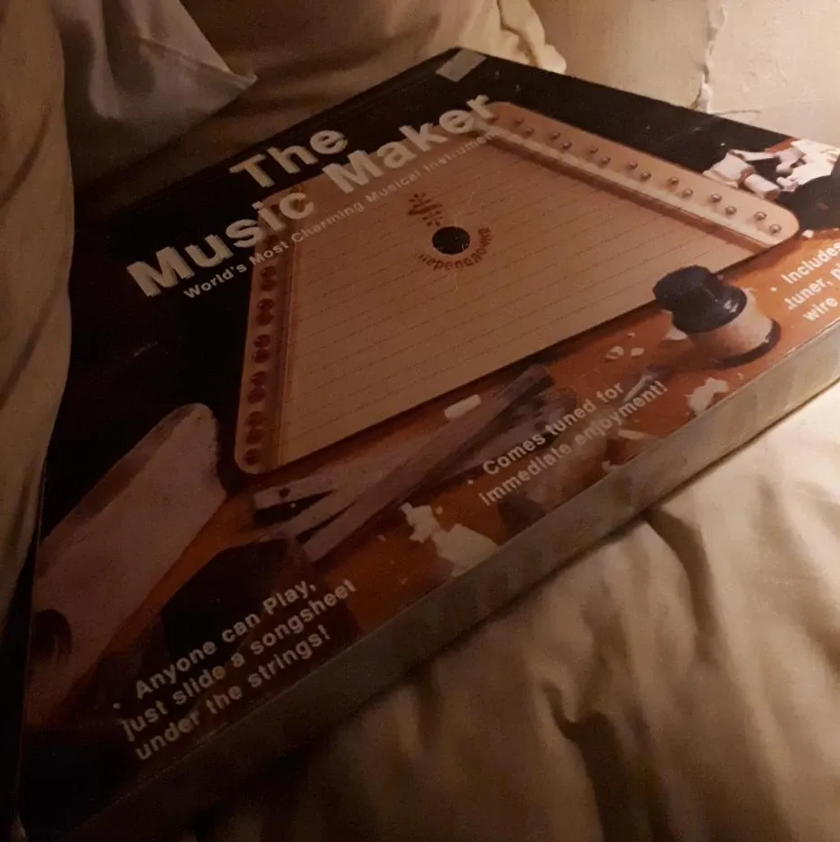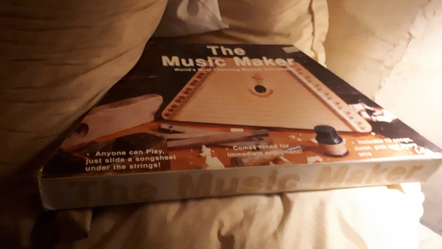 This is The Music Maker, a charming string instrument. It's tuned for immediate enjoyment and anyone can play it by sliding a songsheet under the strings. Includes a tuner and wire.