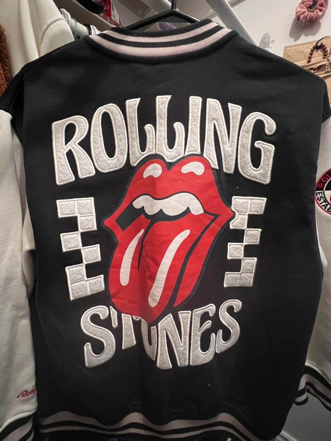 Black and white varsity jacket featuring the Rolling Stones logo and lips. Made in Pakistan. Size 11-12 years, 152 cm. Perfect for any young fan of the iconic band!