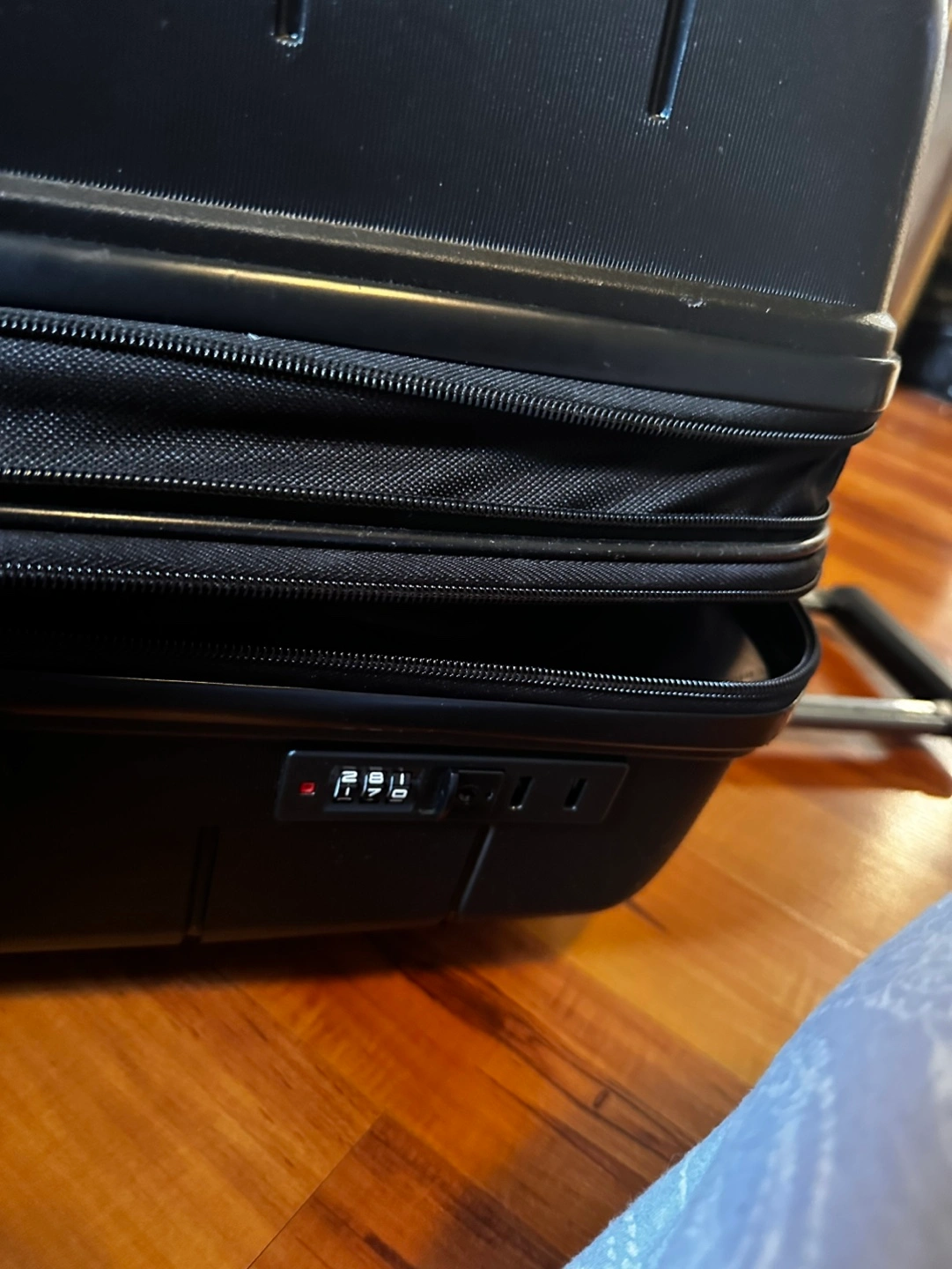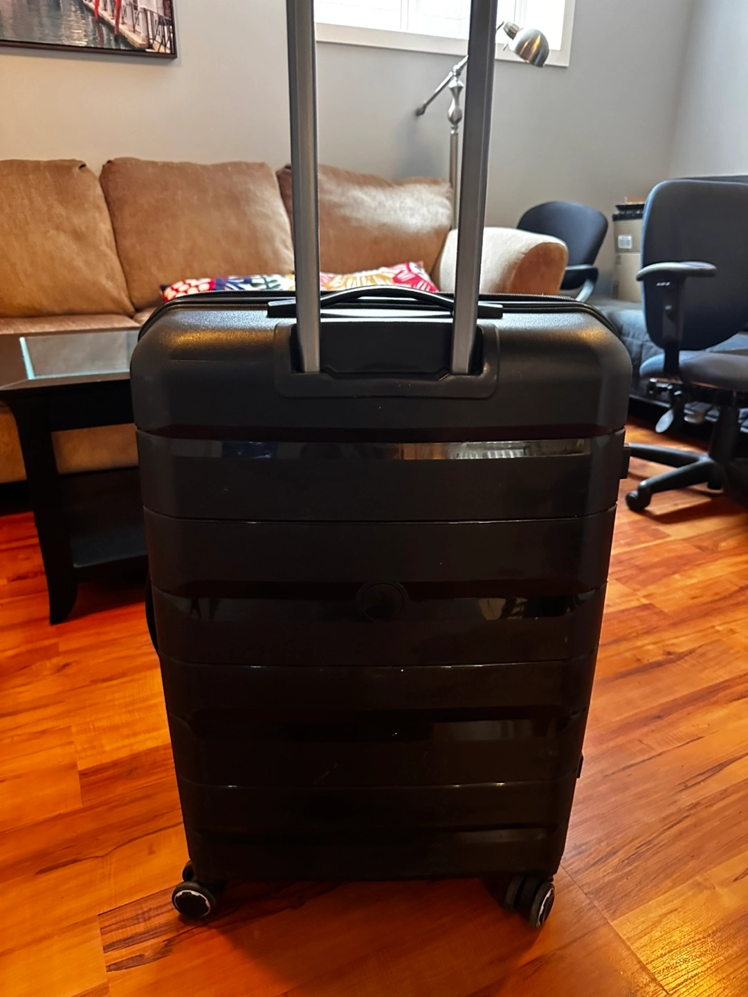 Black hard shell luggage. Four spinner wheels. Telescopic handle. Large interior capacity. Good for travelling. Brand New Lightweight HardShell large suitcase, Expandable and comes with Spinner Wheels, TSA Password Lock.