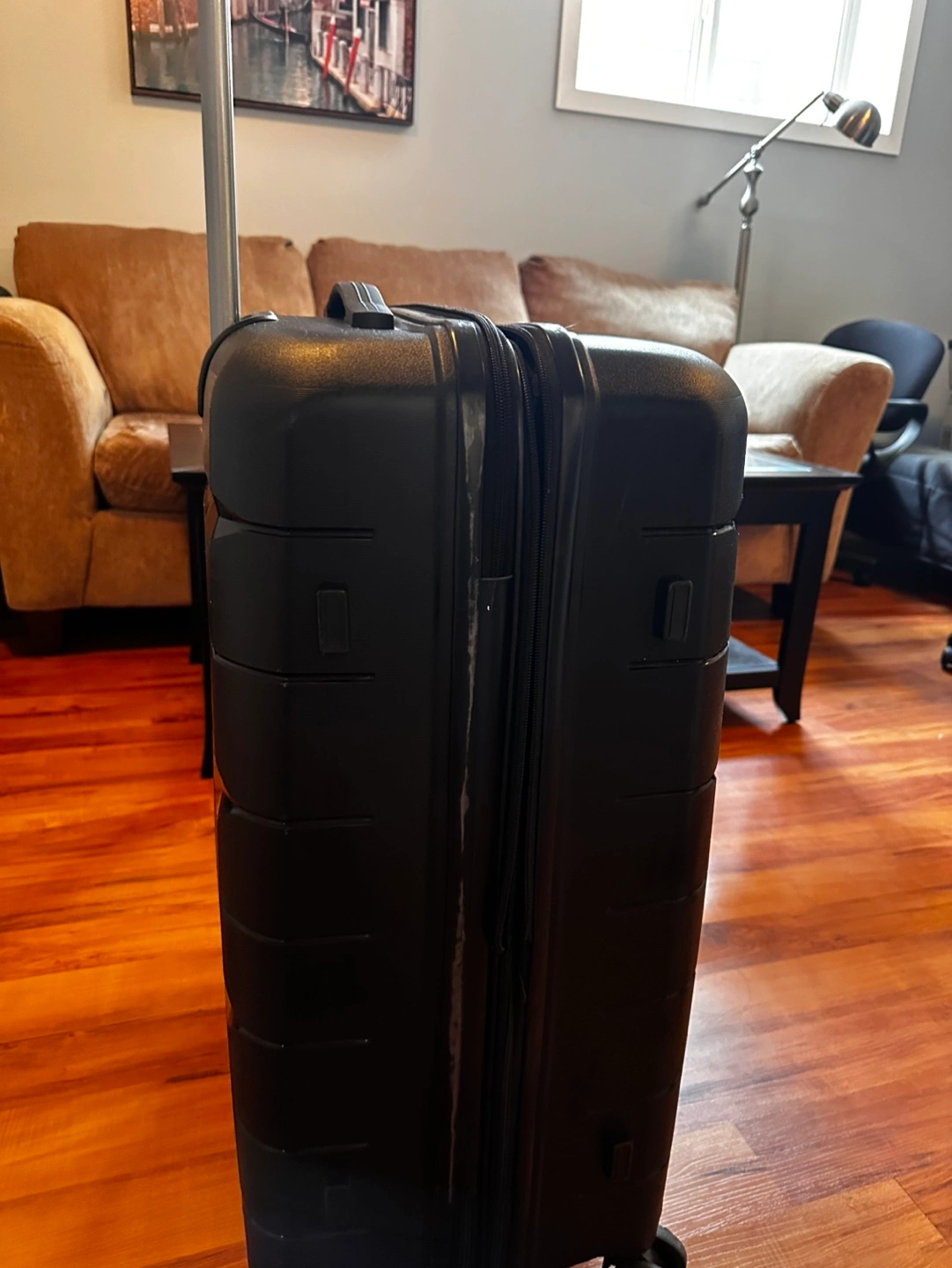 Black hard shell luggage. Four spinner wheels. Telescopic handle. Large interior capacity. Good for travelling. Brand New Lightweight HardShell large suitcase, Expandable and comes with Spinner Wheels, TSA Password Lock.