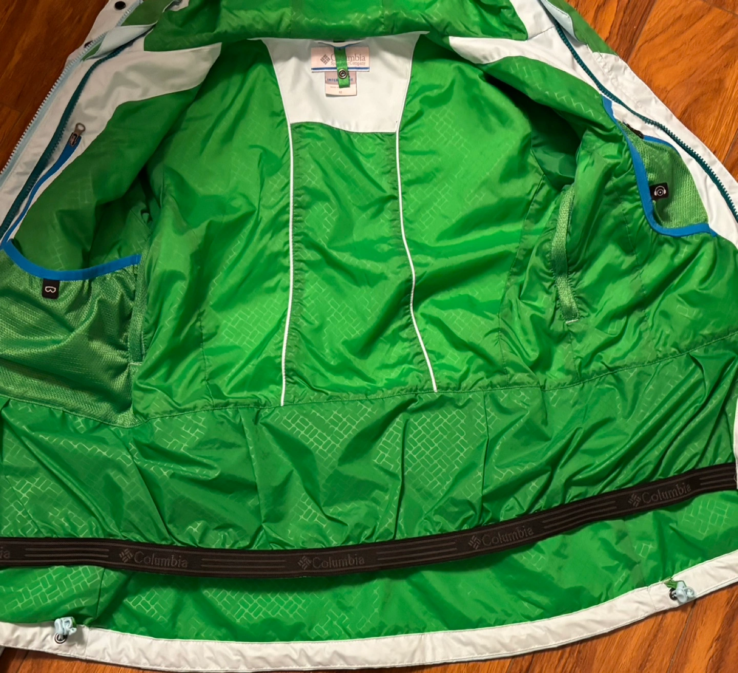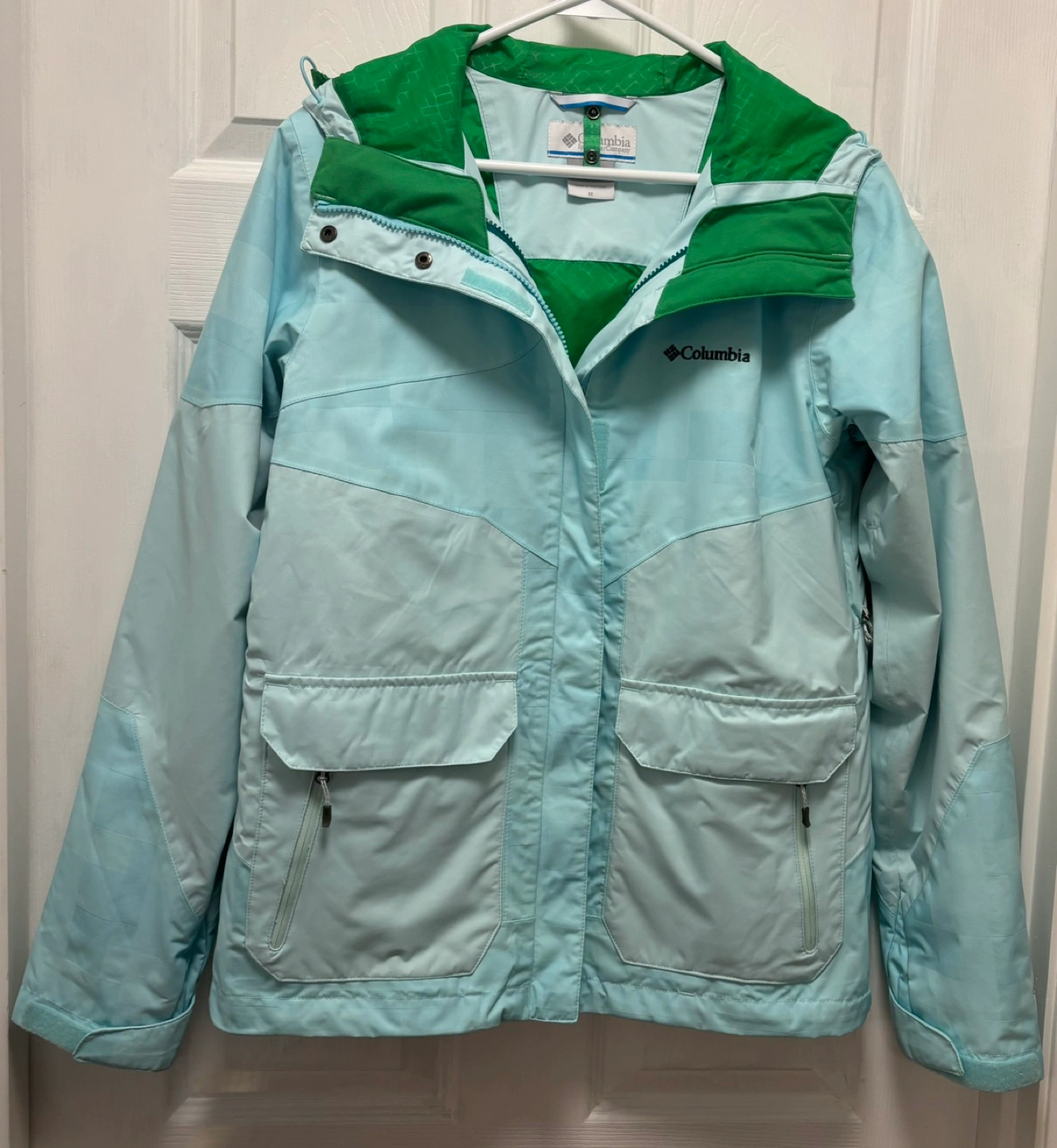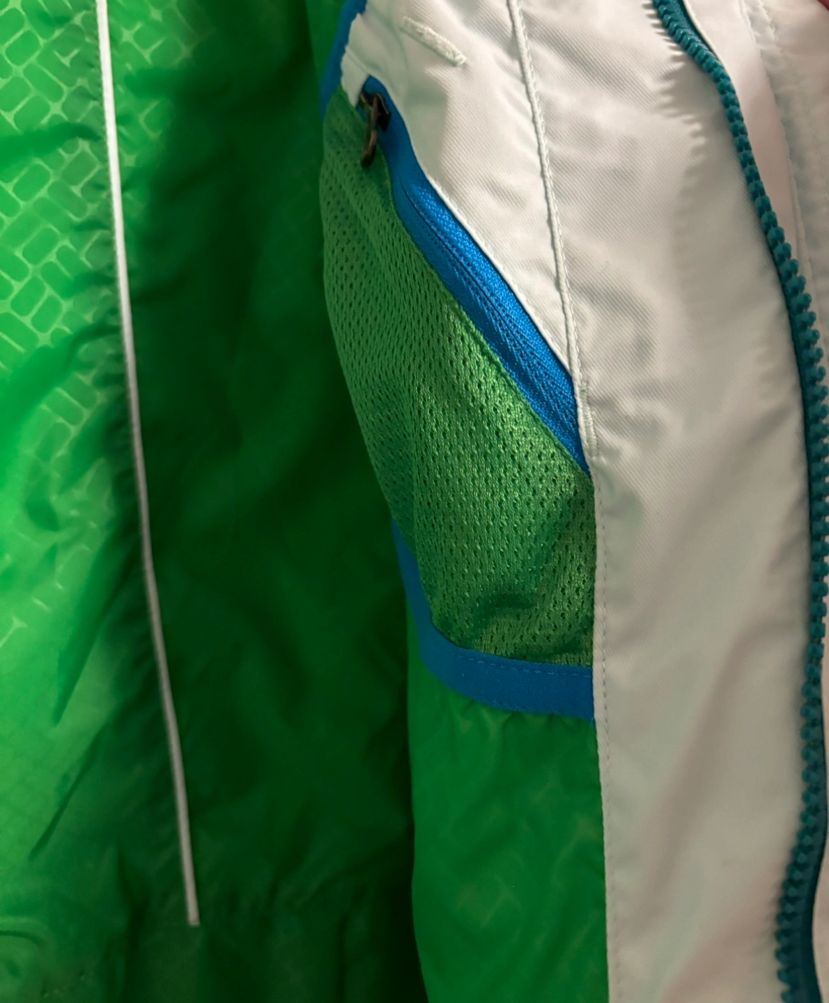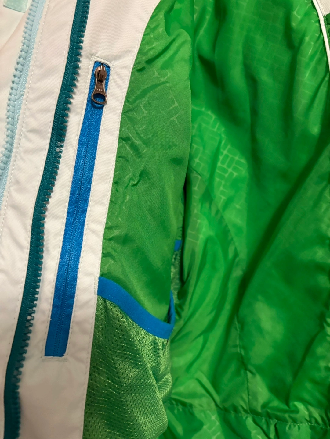 Women's ski jacket with hood, pockets, and Velcro and zipper closure. Green and blue colour scheme. Water and wind resistant outer jacket.