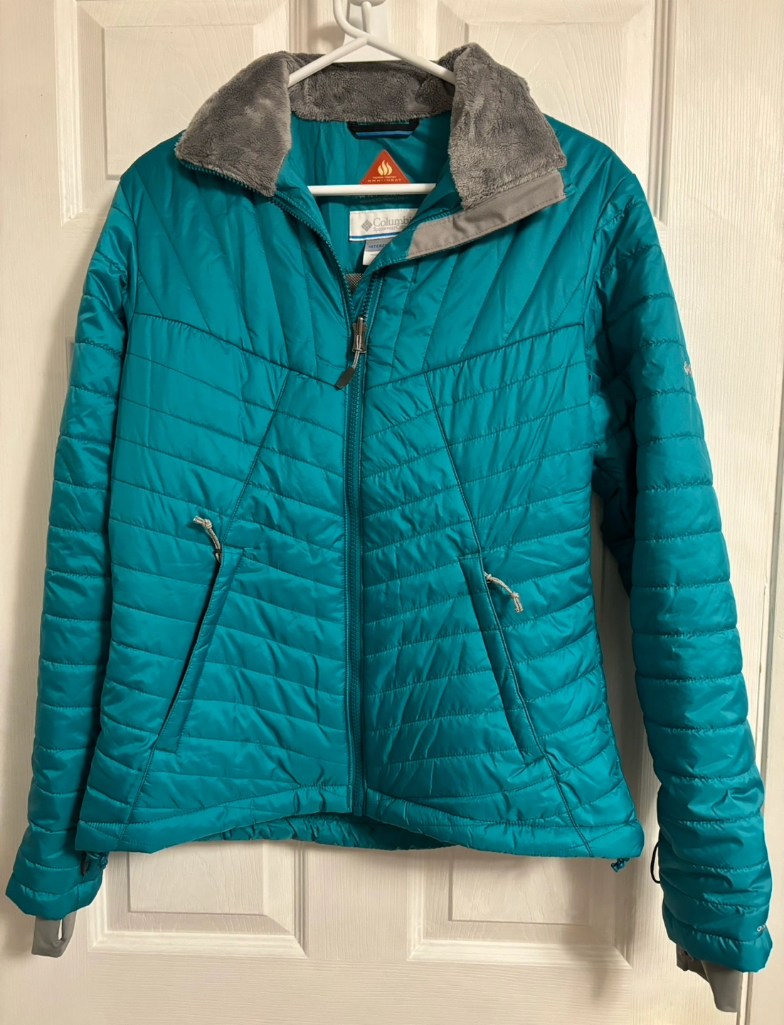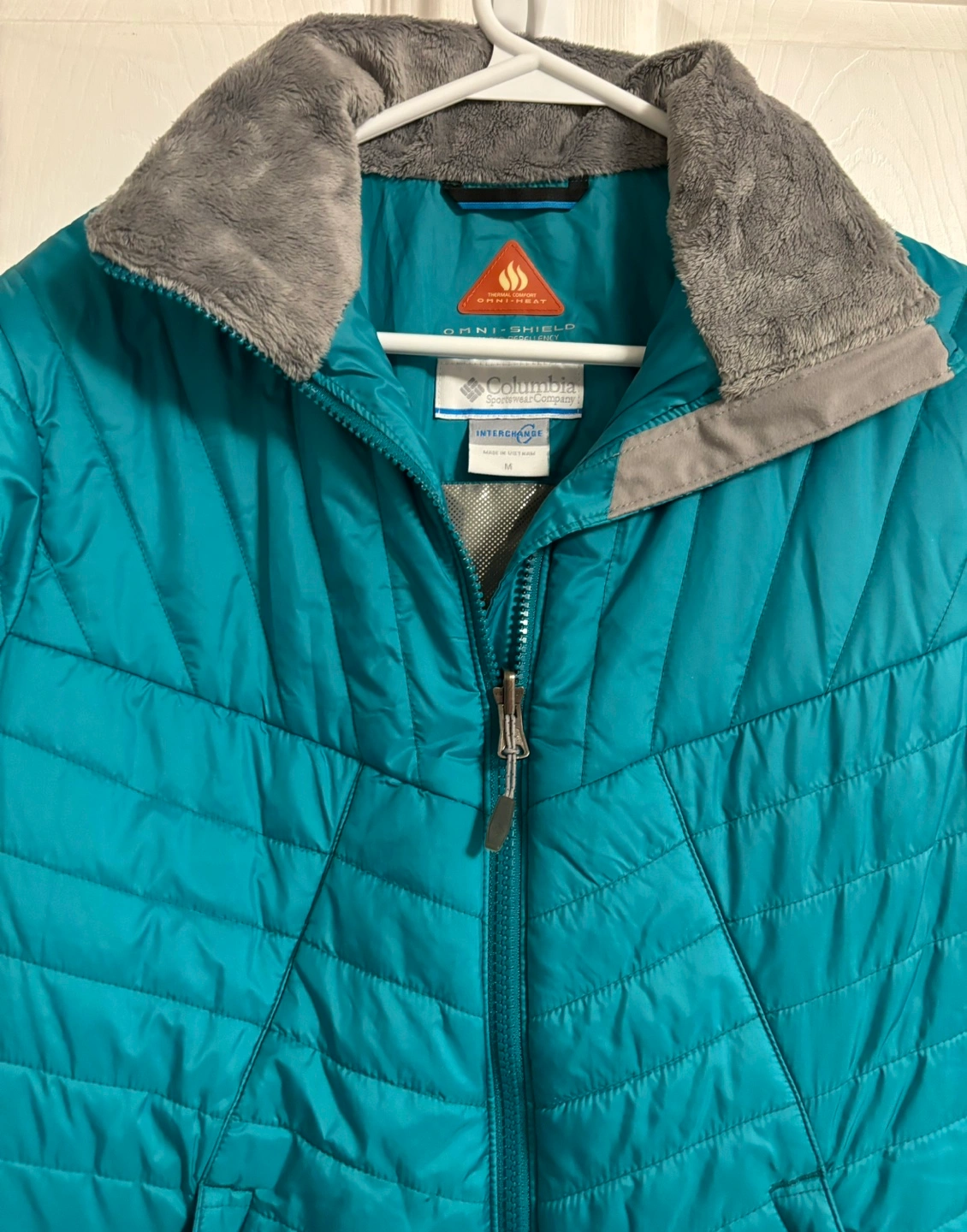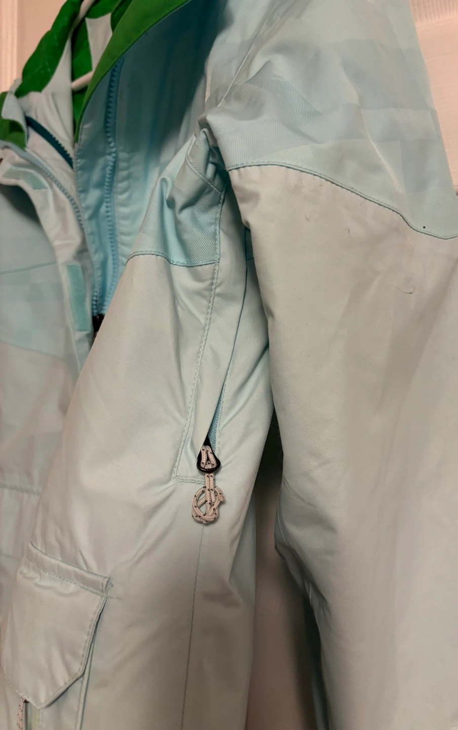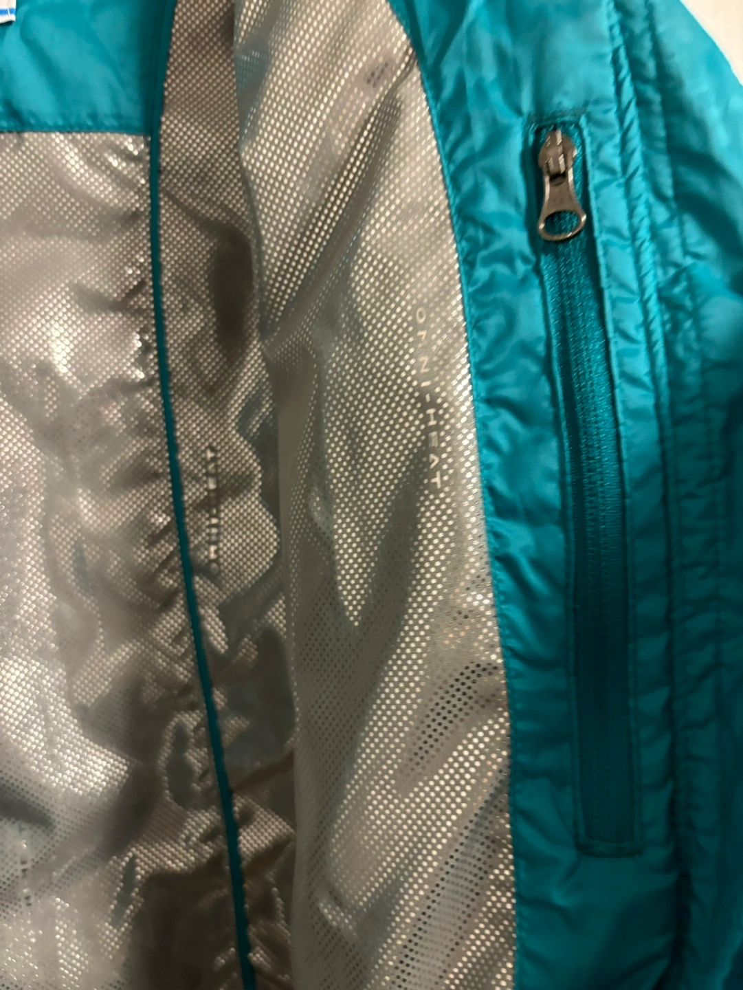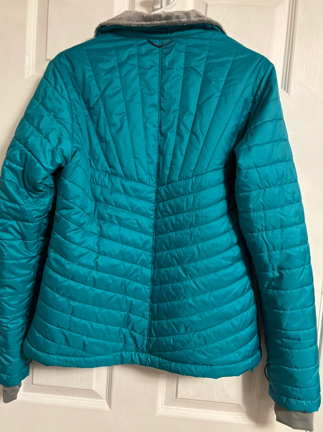 Women's ski jacket with hood, pockets, and Velcro and zipper closure. Green and blue colour scheme. Water and wind resistant outer jacket.