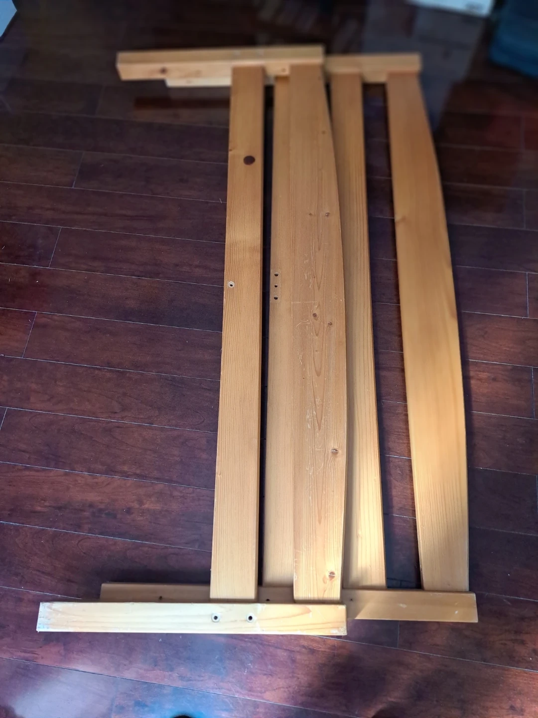 Double size(full size) Wooden bed frame slats and side rails. Solid wood construction. These pieces are from a dismantled bed.