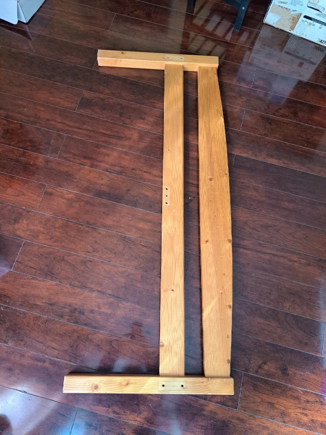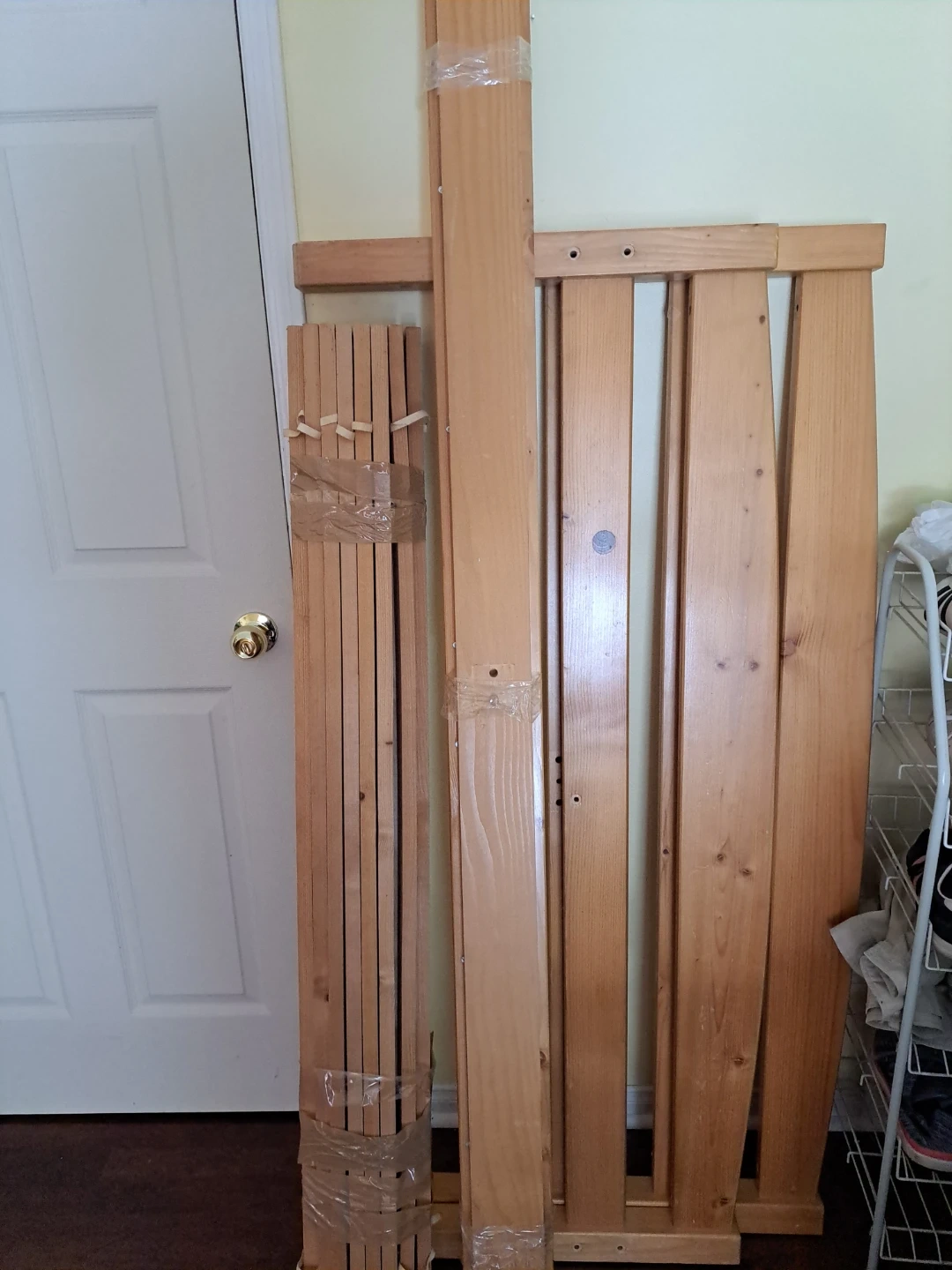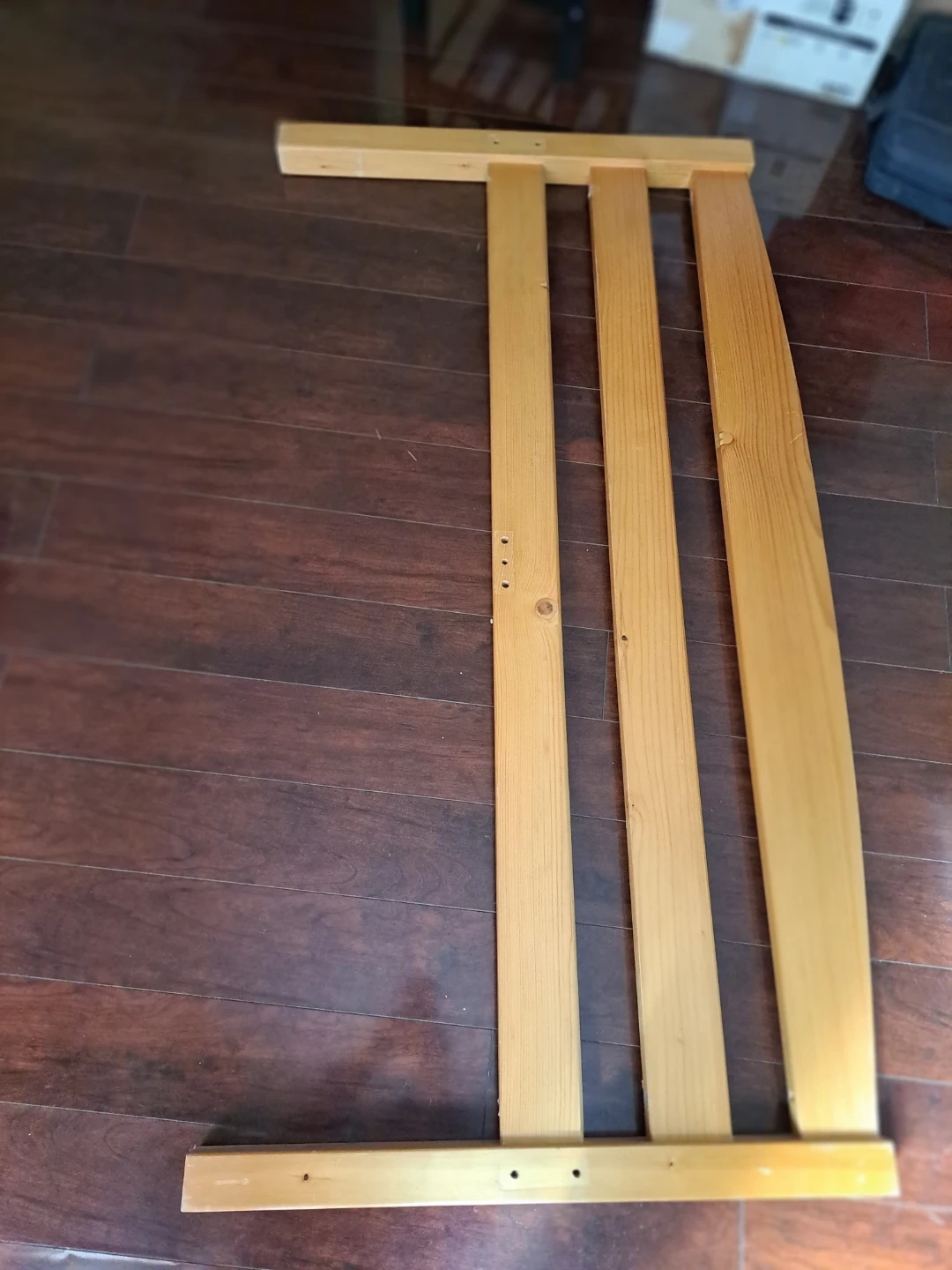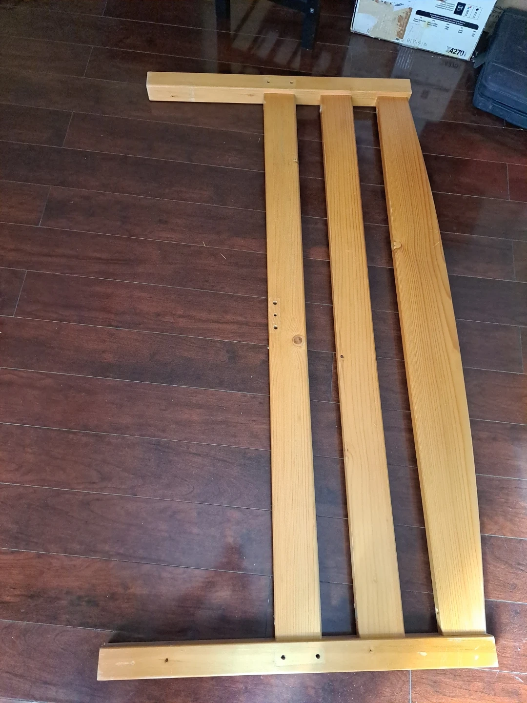 Double size(full size) Wooden bed frame slats and side rails. Solid wood construction. These pieces are from a dismantled bed.