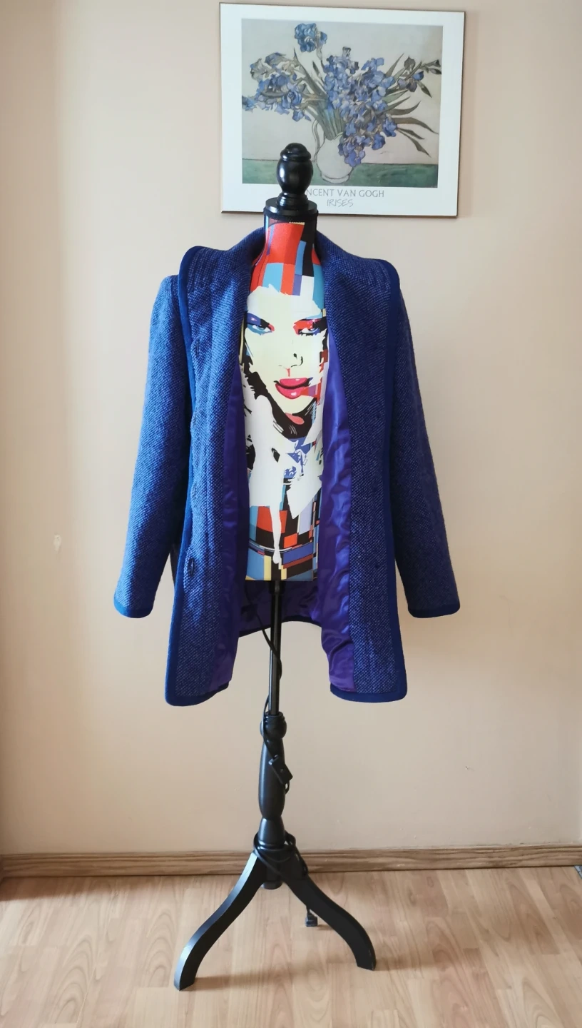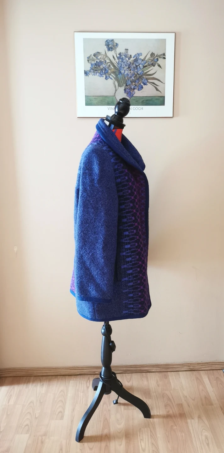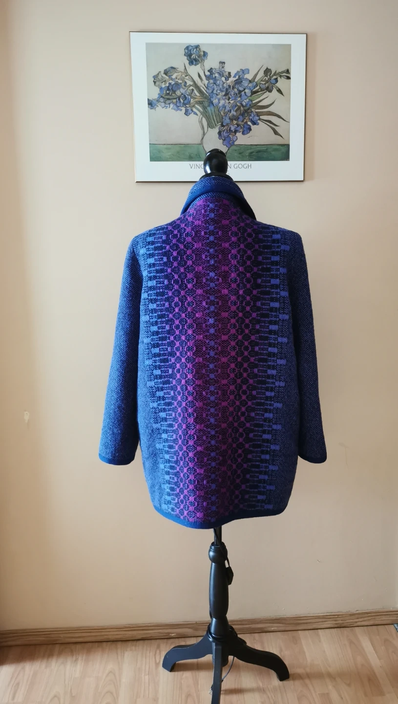 Stunning handcrafted wool jacket by de Weever’s Wovens, made in Aylesford, Nova Scotia, Canada 🇨🇦. Known for their handcrafted garments, this brand specializes in timeless, durable pieces made from 100% wool using traditional weaving techniques. This piece showcases the brand’s signature artisan weaving, featuring a rich textured knit with an eye-catching geometric pattern in vibrant blue and purple tones.