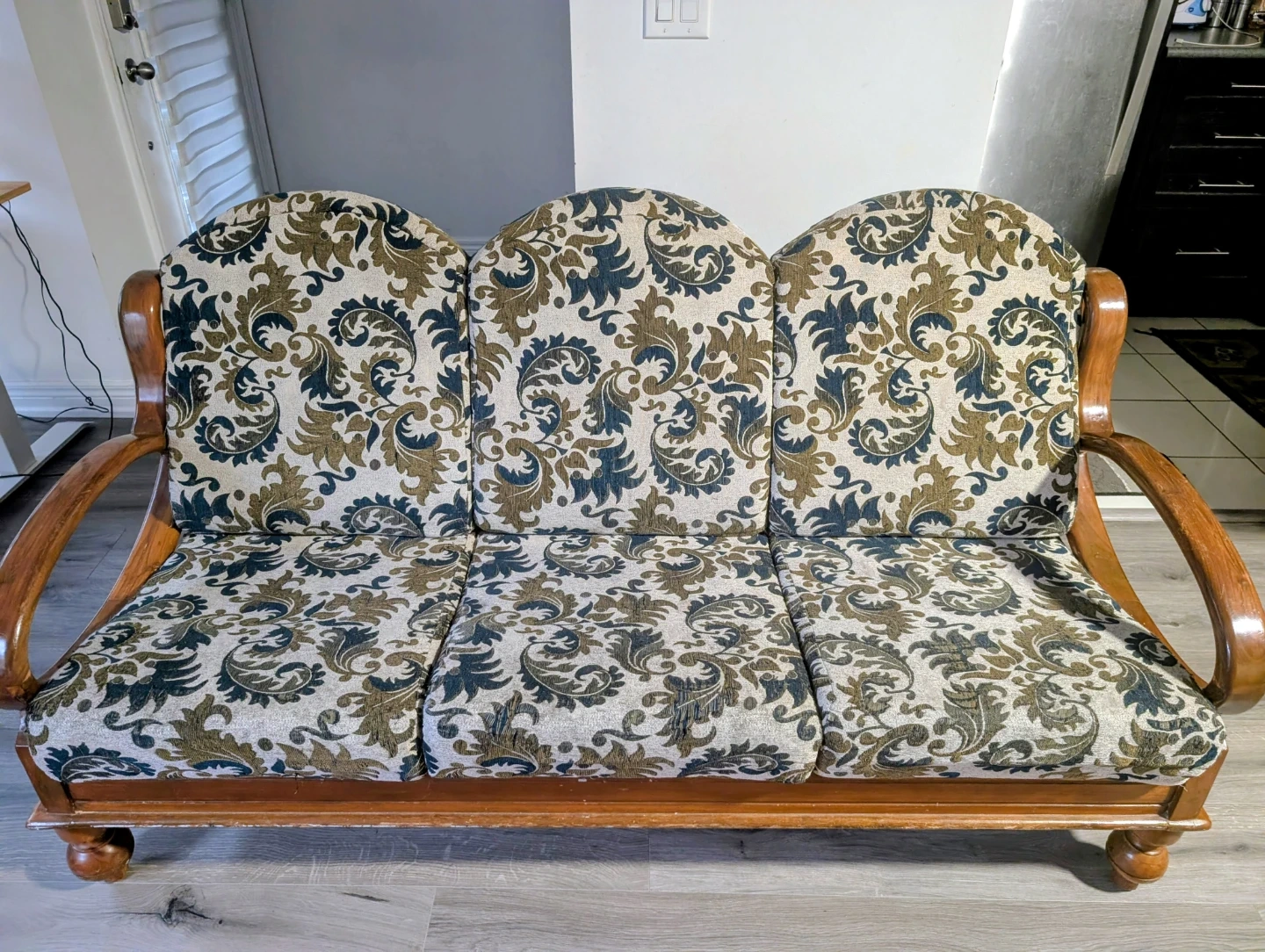 Three-seater sofa featuring a damask-style floral print fabric in shades of blue, brown, and beige. It has a solid wood frame with curved armrests and turned legs. The upholstery pattern covers the back cushions and seat cushions.