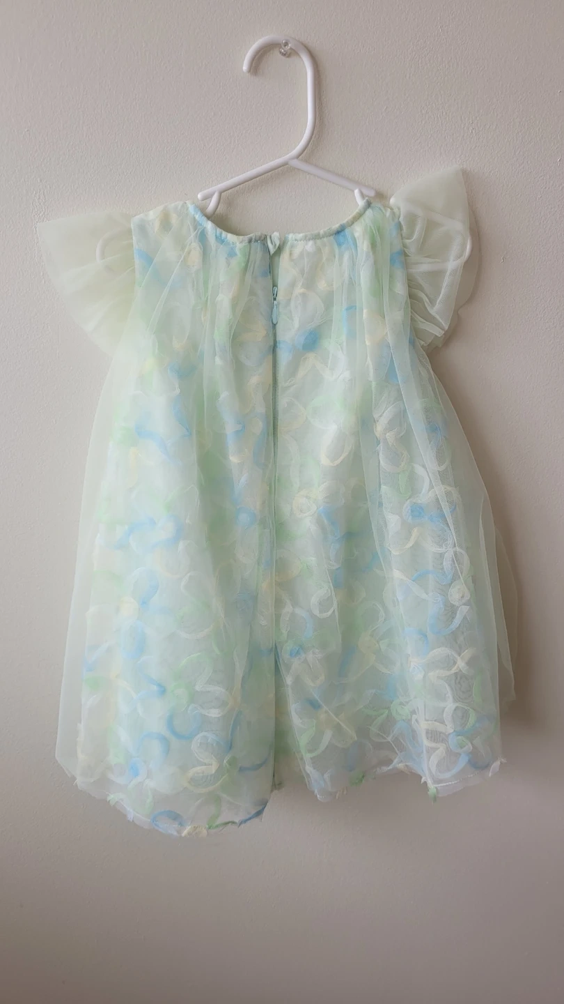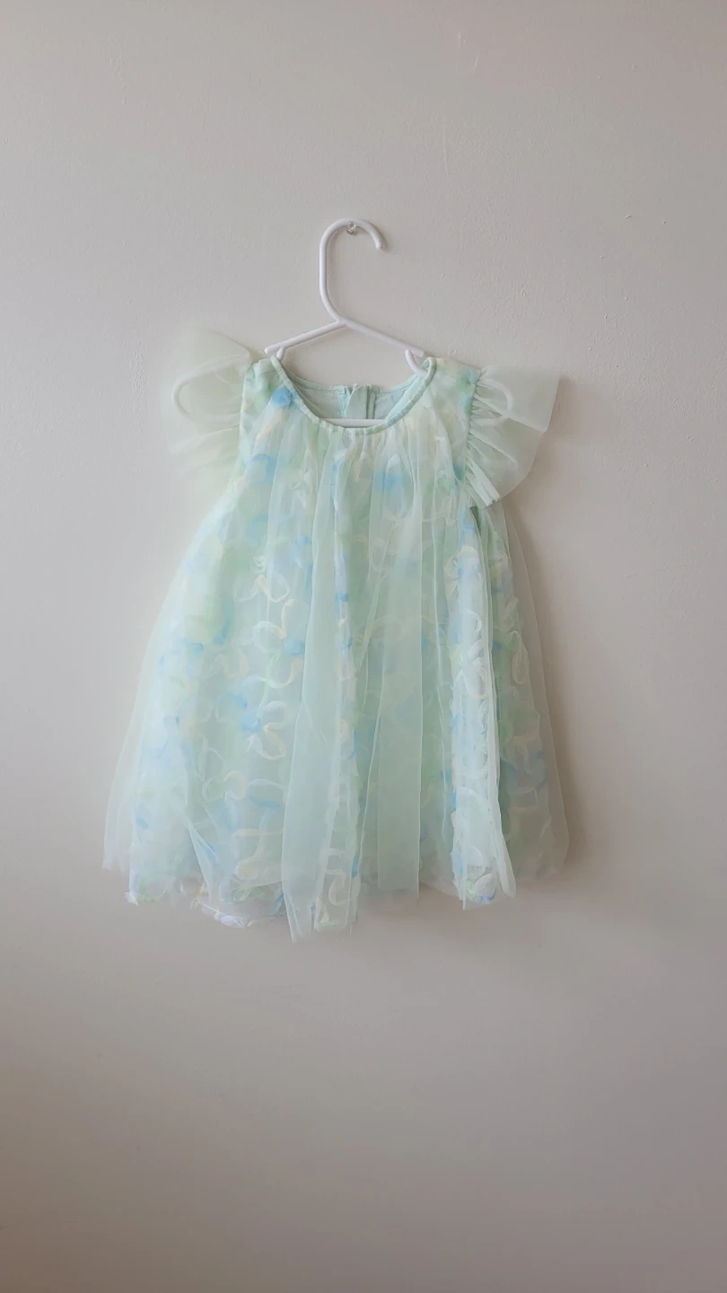 This is a cute baby girl's dress with a pastel floral pattern. It features a light, airy overlay with flutter sleeves. It's perfect for special occasions or photoshoots. Zipper closure at the back.