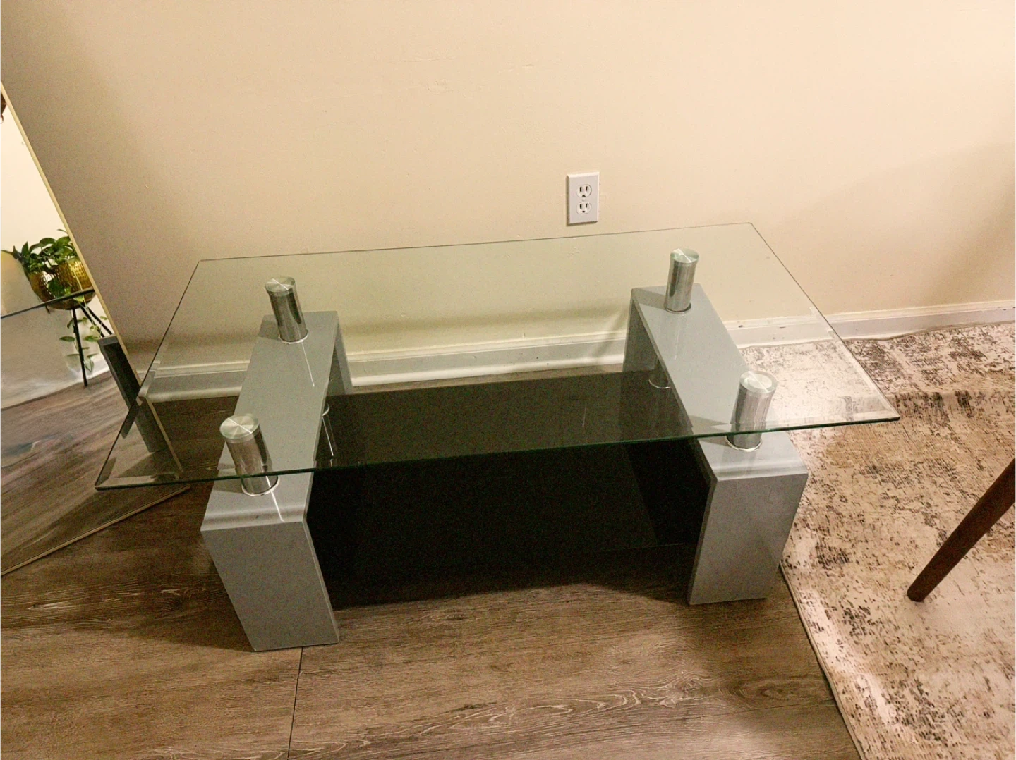 Modern coffee table with a clear glass top and a sleek gray and black base. It's a stylish addition to any living room. The table measures 40 inches long, 20 inches wide, and 17 inches tall.