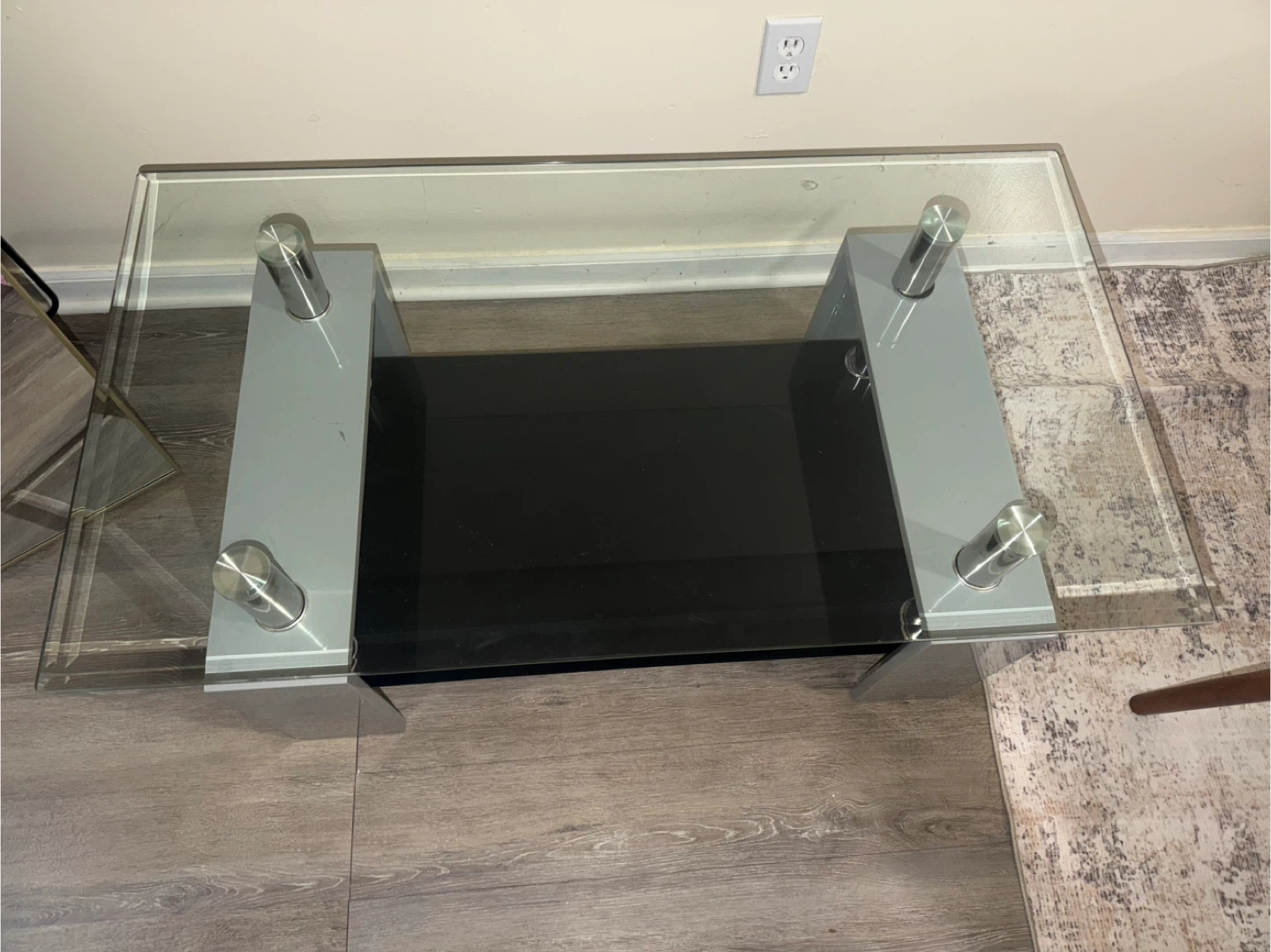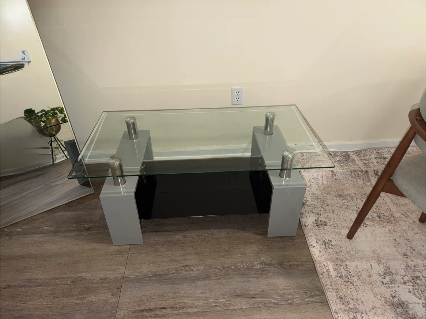 Modern coffee table with a clear glass top and a sleek gray and black base. It's a stylish addition to any living room. The table measures 40 inches long, 20 inches wide, and 17 inches tall.