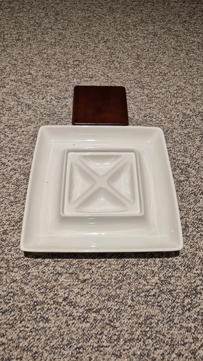 This is a 2-in-1 cheese board and tidbit platter from the Mendoza Collection by Joshua Maxwell Studio. It's made of white ceramic with a wooden inlay for serving. This platter is useful for serving cheese, crackers, or other appetizers.