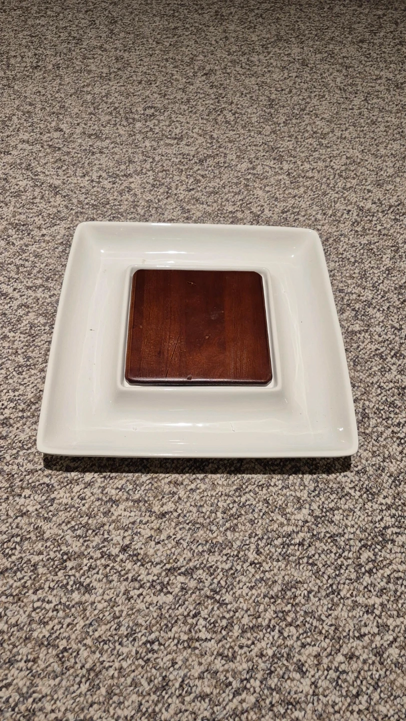 This is a 2-in-1 cheese board and tidbit platter from the Mendoza Collection by Joshua Maxwell Studio. It's made of white ceramic with a wooden inlay for serving. This platter is useful for serving cheese, crackers, or other appetizers.