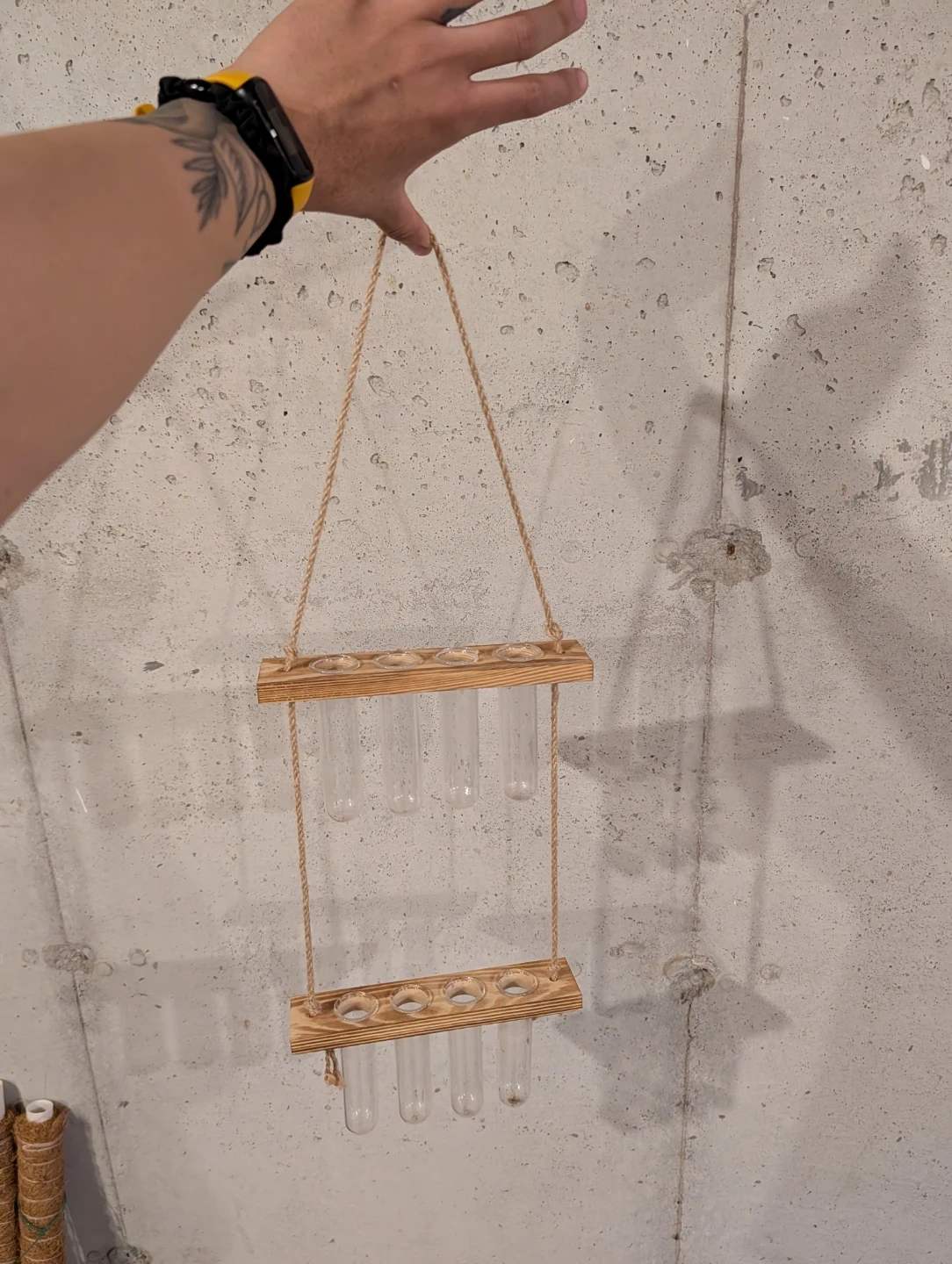 This wooden propagation station holds six glass test tubes. It's perfect for starting plant cuttings or displaying small flowers. The natural wood and twine construction adds a rustic touch to any space.