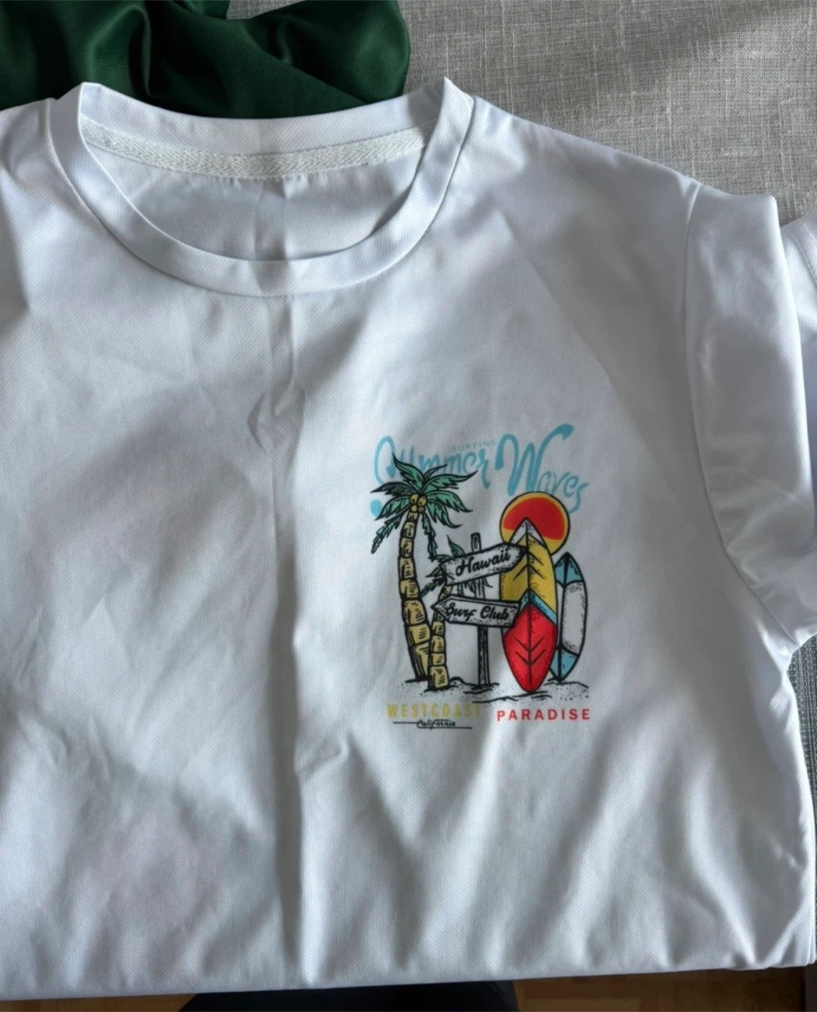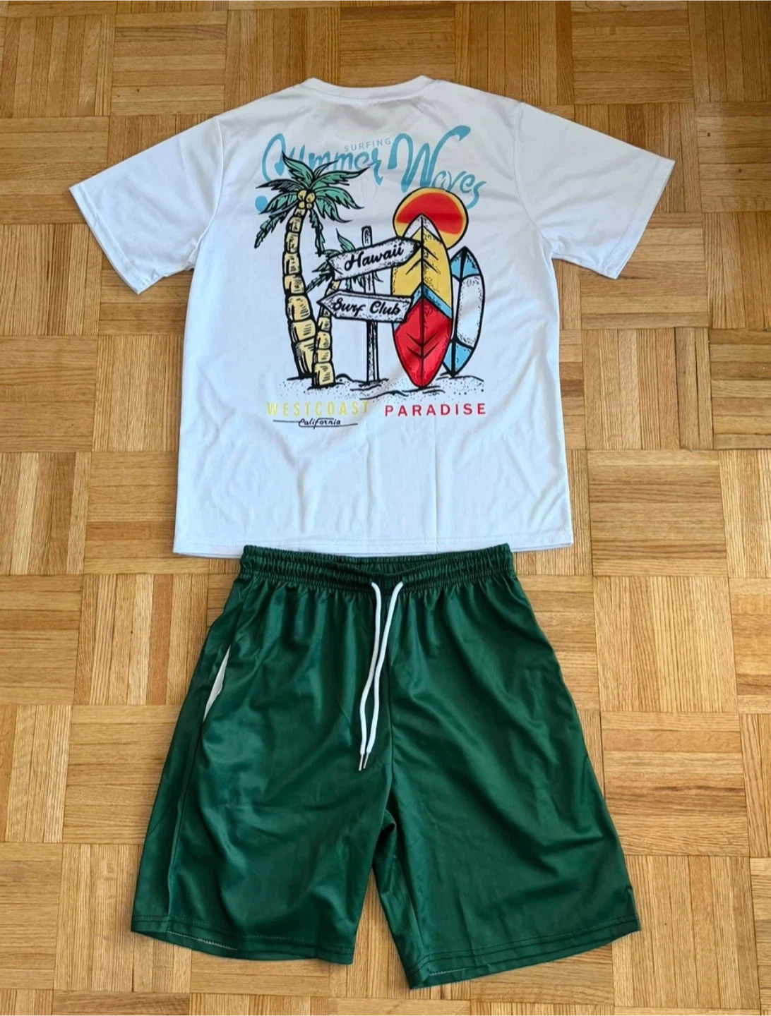 White t-shirt with a 'Summer Waves Hawaii Surf Club' graphic and green athletic shorts. It's a comfy set for warm weather activities.