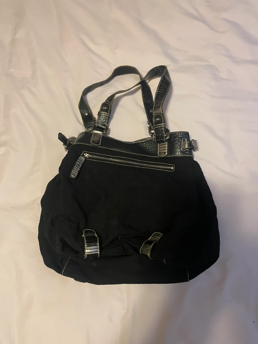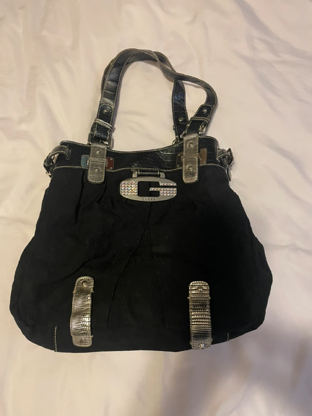 This black GUESS shoulder bag features a textured fabric body and faux croc accents. It has a zip-top closure and an embellished "G" logo on the front. It's a stylish accessory for everyday use.