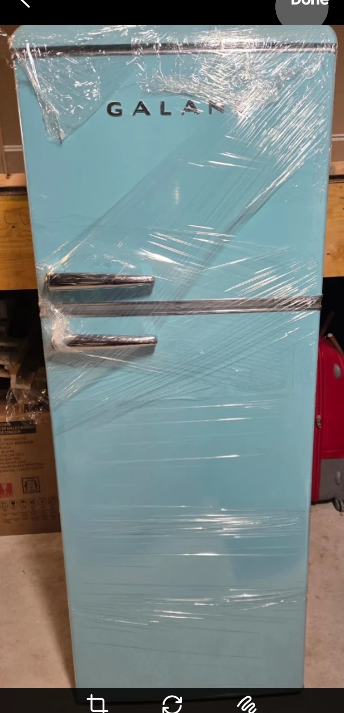 Selling a Galan retro-style mini fridge in a lovely light blue colour. It's still wrapped in its protective plastic, ready for your space! Perfect for a dorm, office, or just adding a touch of vintage charm to any room