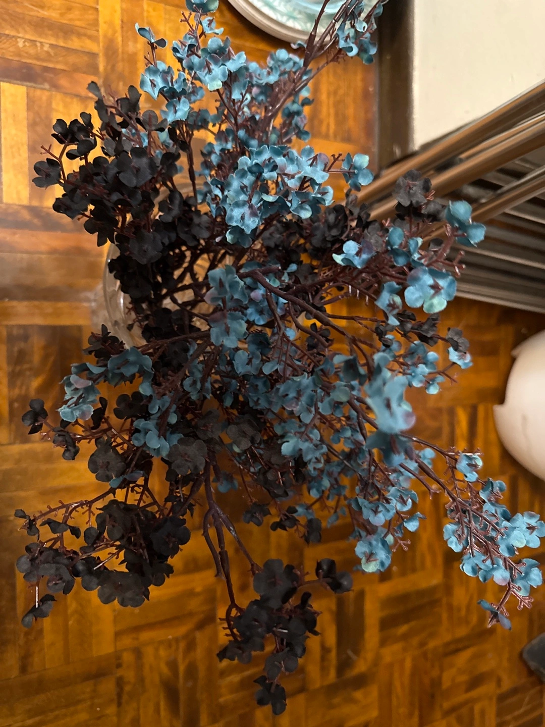 Beautiful artificial flower arrangement. Features teal and black flowers. Looks great in a vase. Perfect for home décor.