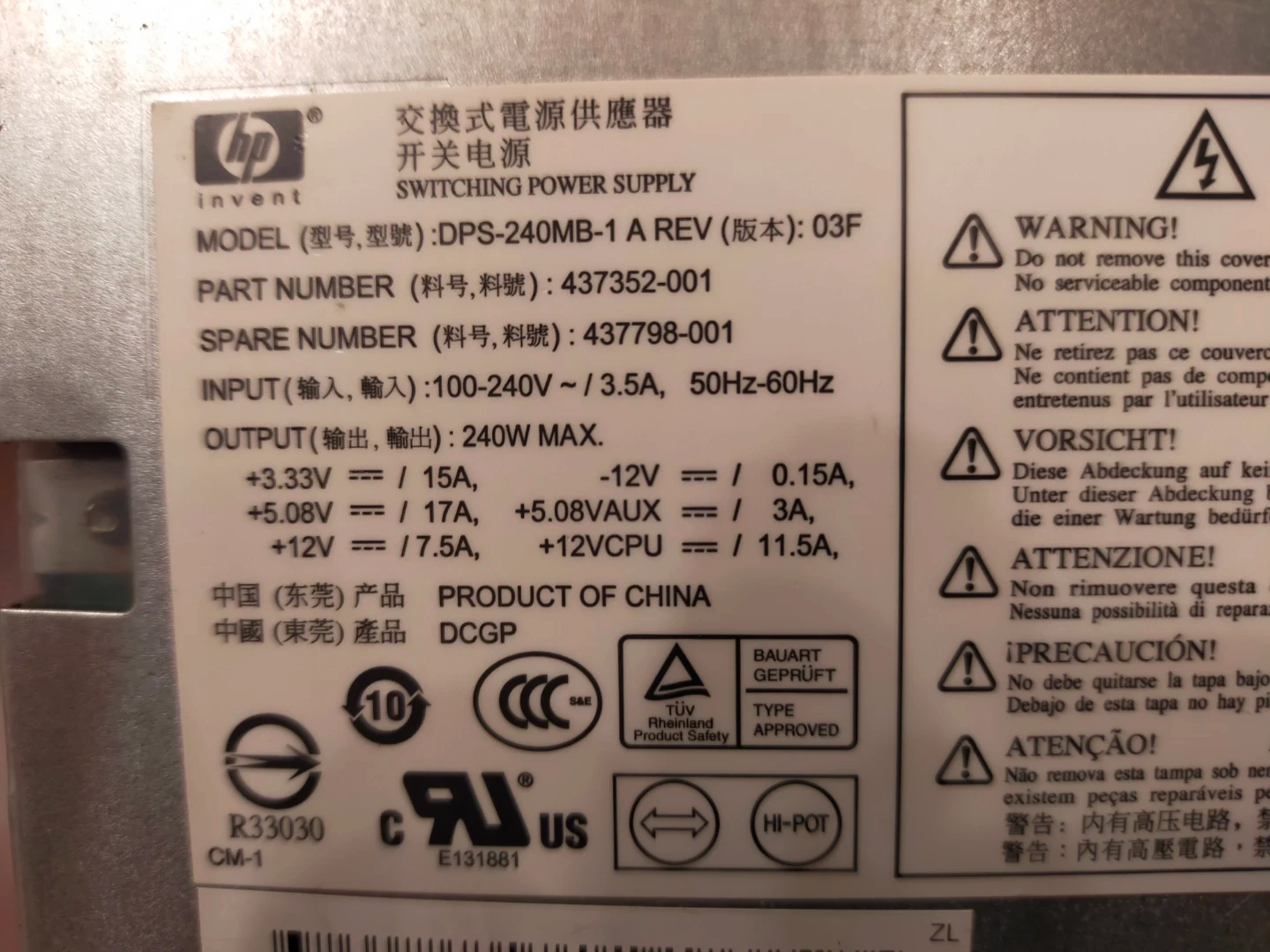 HP DPS-240MB-1 A switching power supply. It's a 240W max unit. Input is 100-240V, 50-60Hz. This power supply would be useful for a desktop computer build or replacement.
