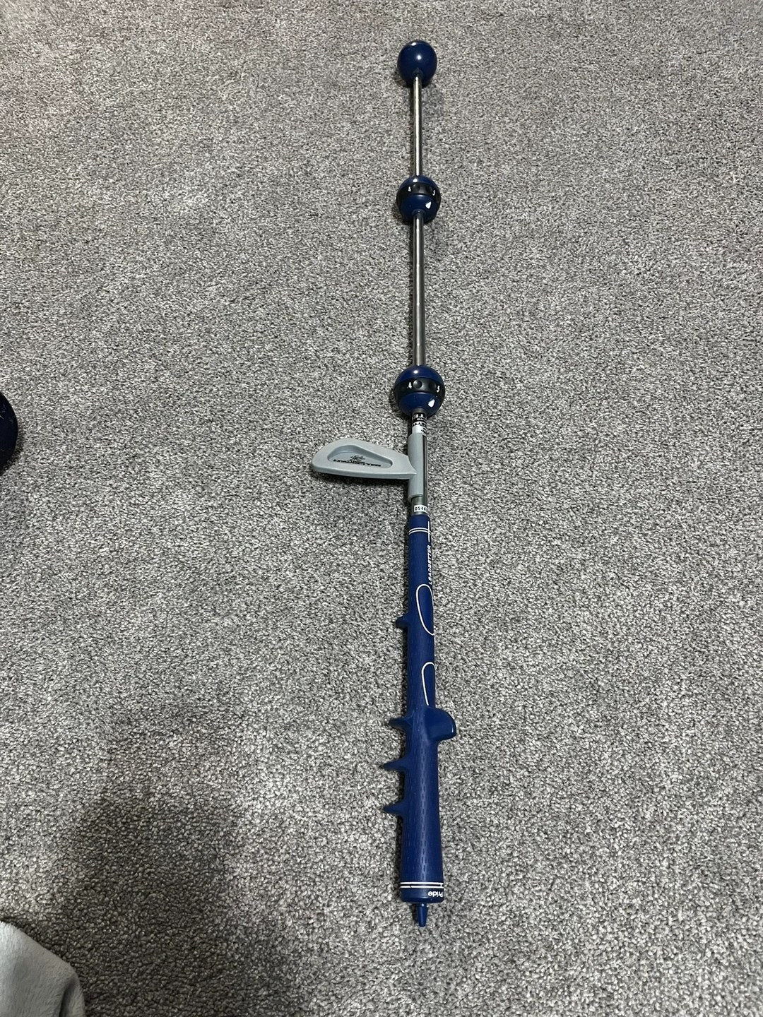 This golf swing trainer helps you to improve your swing. It is blue and silver in colour. It is in good condition.