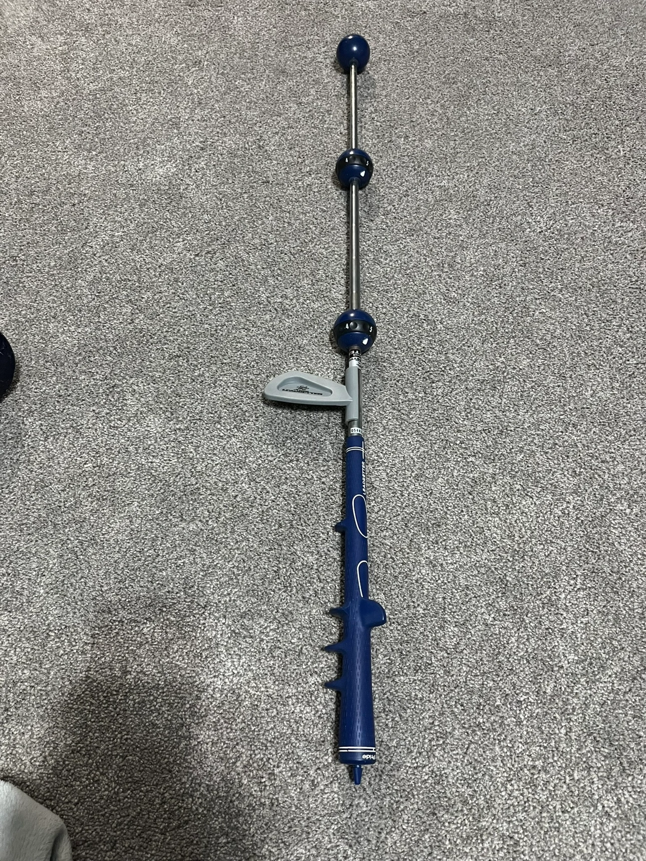 This golf swing trainer helps you to improve your swing. It is blue and silver in colour. It is in good condition.