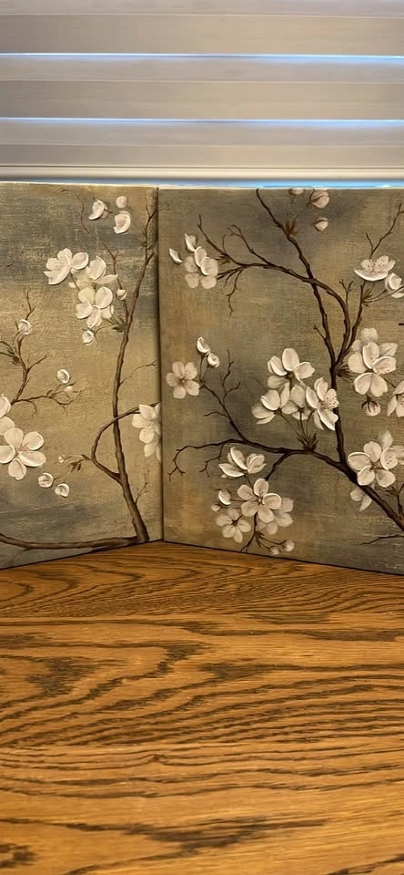 Textured cherry blossom art set. Two canvases with white flowers and branches. Muted background colors. Looks great in any room. Let me know if you're interested!
