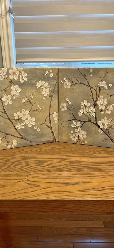 Textured cherry blossom art set. Two canvases with white flowers and branches. Muted background colors. Looks great in any room. Let me know if you're interested!