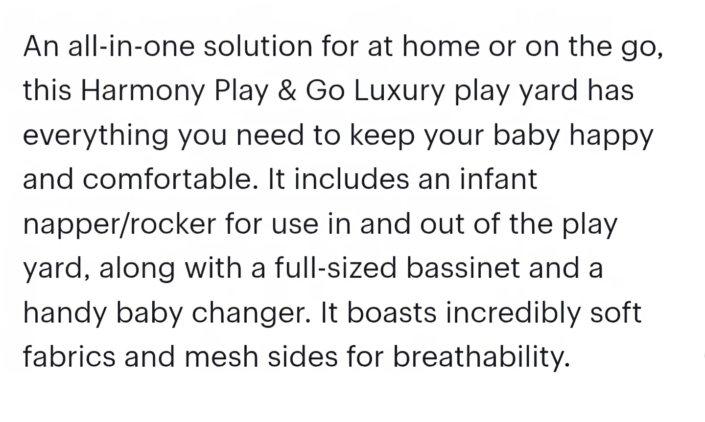 This Harmony Play & Go Luxury play yard is an all-in-one solution for at home or on the go. It includes an infant napper/rocker, a full-sized bassinet, and a handy baby changer. Soft fabrics and mesh sides offer breathability.