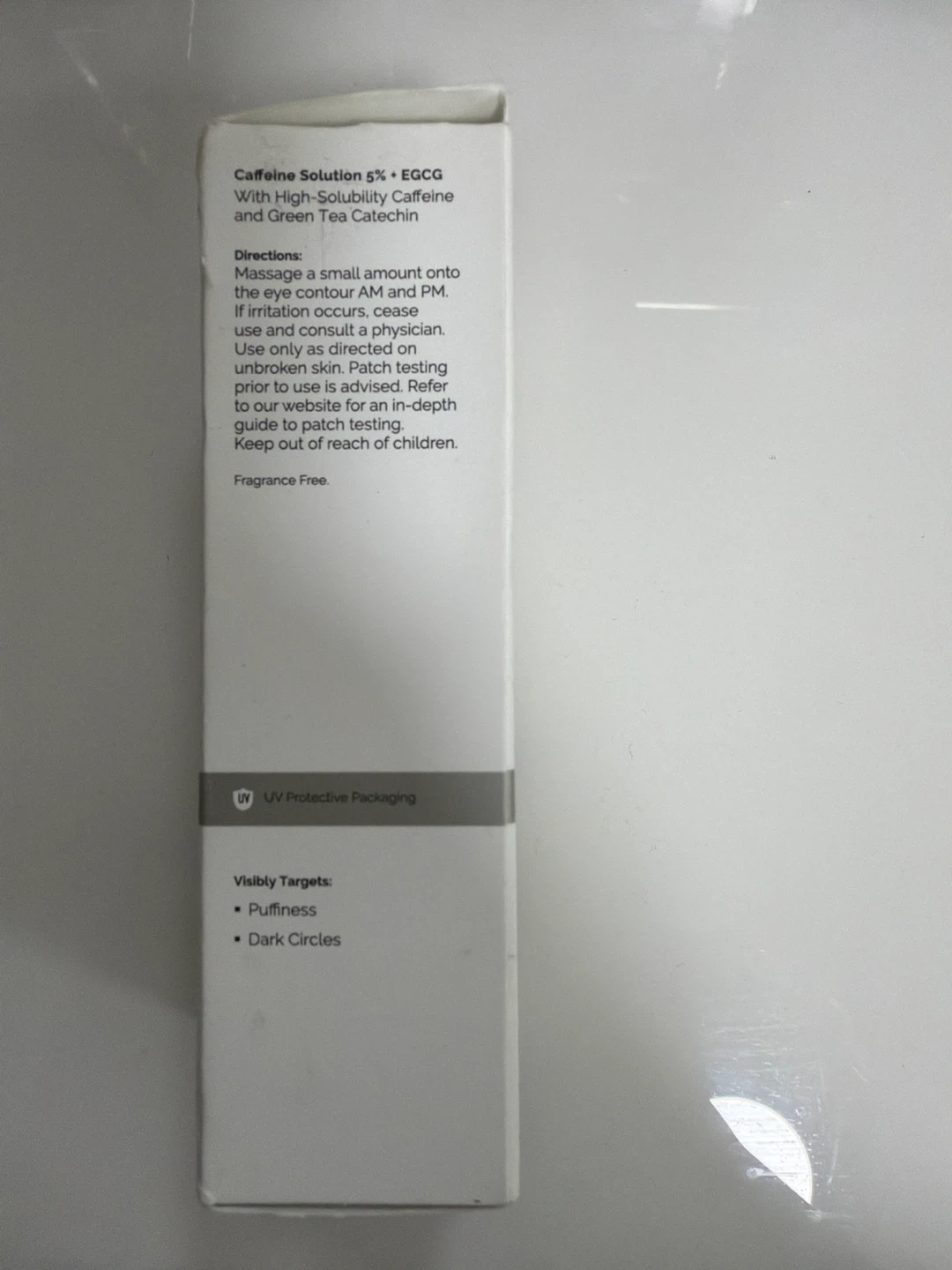 Selling The Ordinary Caffeine Solution 5% + EGCG, which reduces the appearance of eye contour pigmentation and puffiness. It comes in a 30mL (1 fl oz U.S.) bottle. This solution contains high-solubility caffeine and green tea catechin. Massage a small amount onto the eye contour AM and PM. It targets puffiness and dark circles