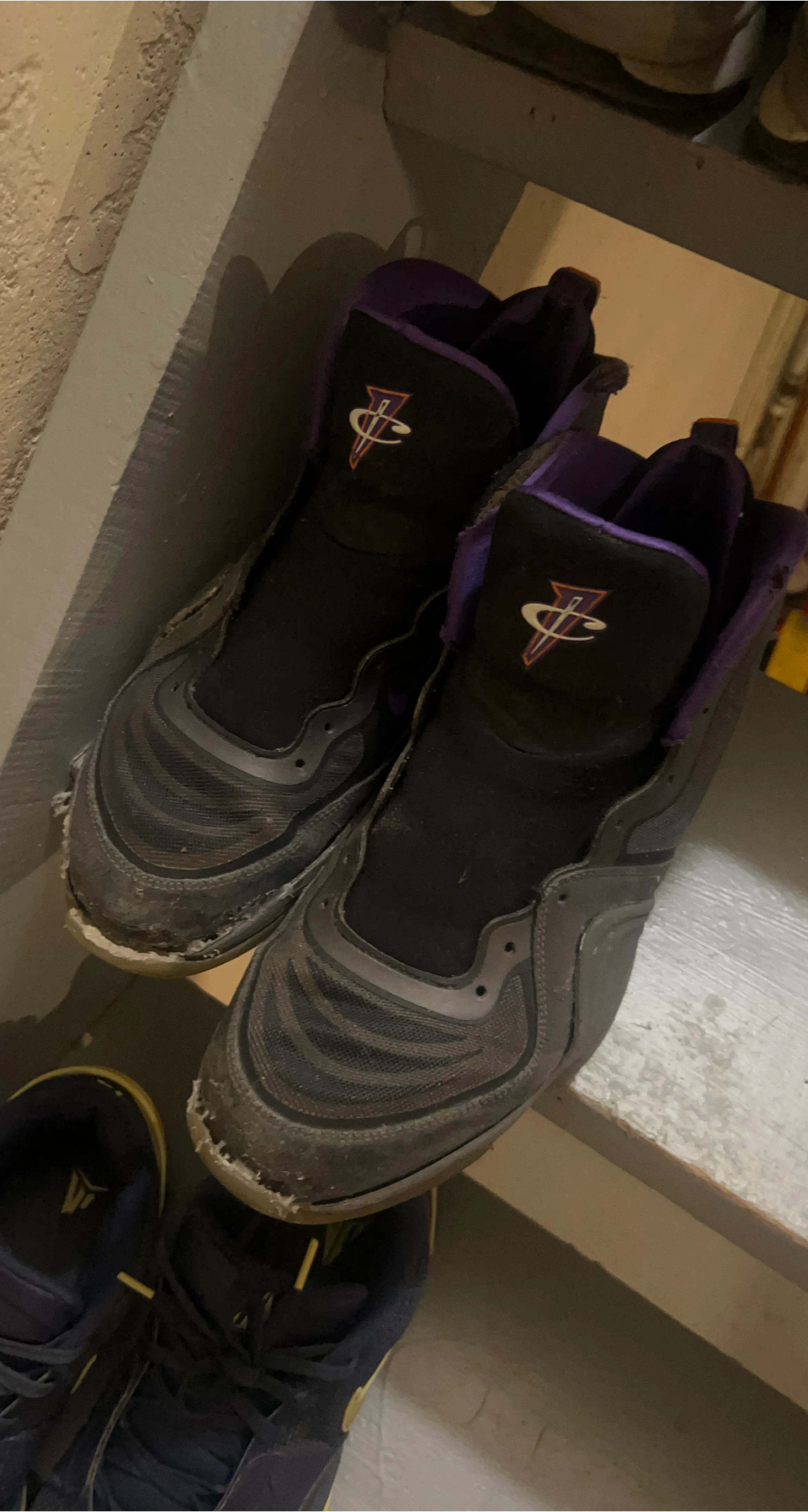 These Nike Air Flightposite III sneakers come in black and purple. They feature a unique zip-up closure system. Good for casual wear or basketball.