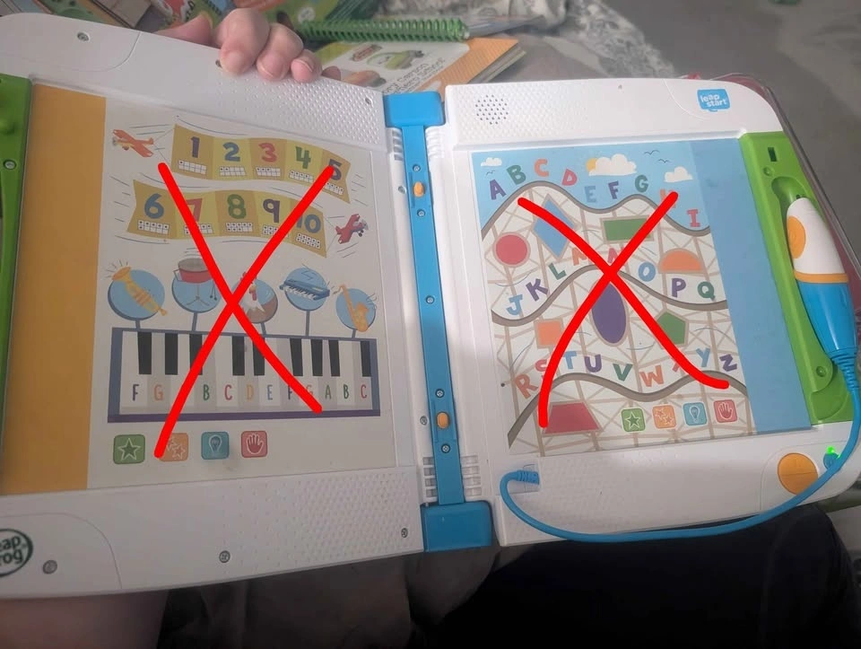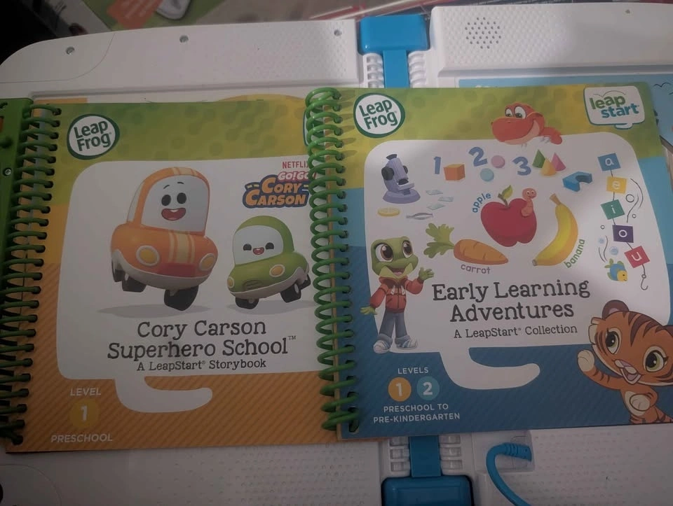 Fun LeapFrog LeapStart system. This is the interactive learning device with the stylus. Great for kids to learn and read. It's well loved, the two pages on the physical leapfrog do not work (shown in the photo) but it works well with all LeapStart books. It comes with 2 books.