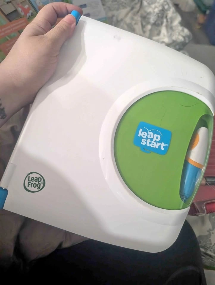 Fun LeapFrog LeapStart system. This is the interactive learning device with the stylus. Great for kids to learn and read. It's well loved, the two pages on the physical leapfrog do not work (shown in the photo) but it works well with all LeapStart books. It comes with 2 books.