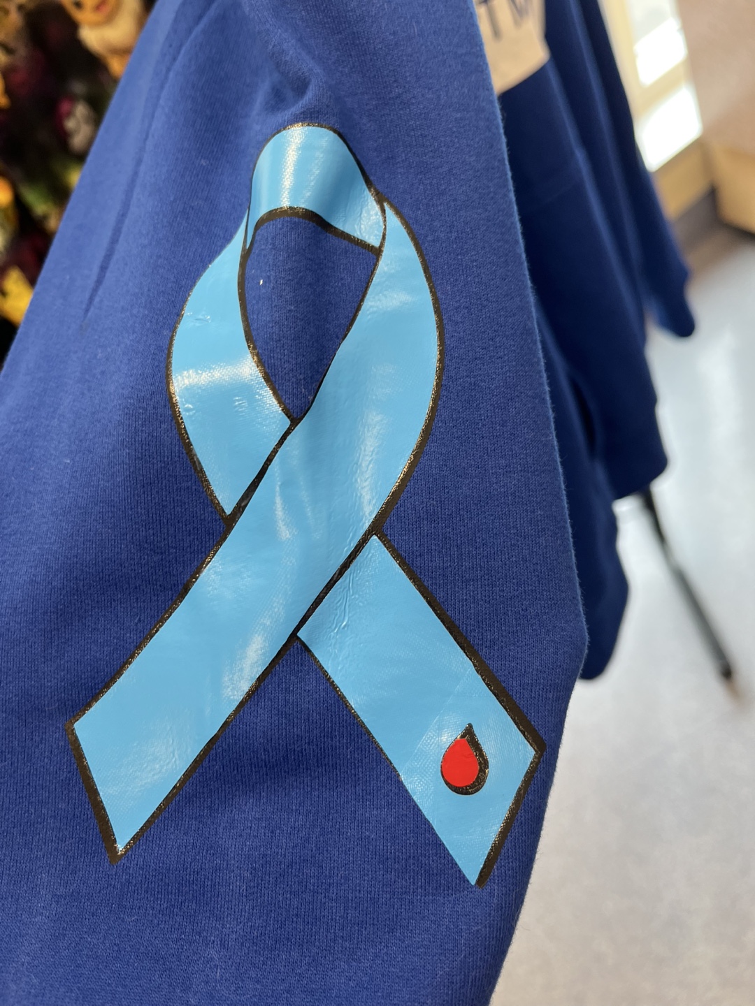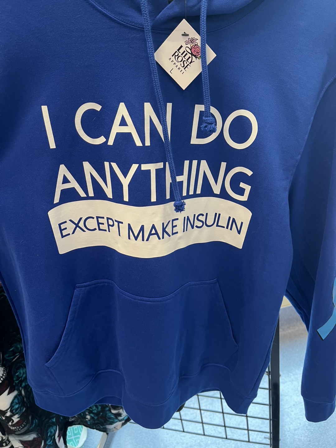 Adult large blue hoodie. Features a light blue ribbon with a red droplet and the phrase "I can do anything except make insulin". 60% cotton, 40% polyester. Made in India.