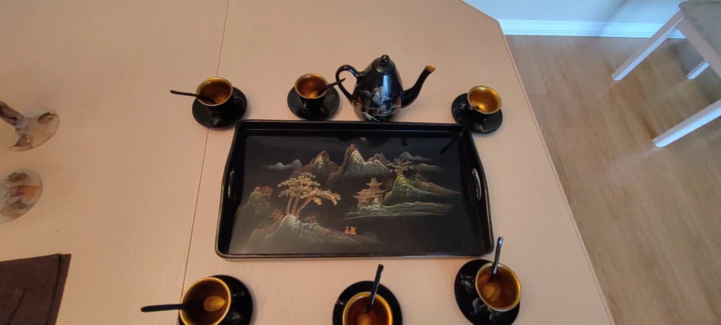 This vintage decorative Japanese wooden tea set includes a teapot, six cups, six saucers, a tray, and six spoons. The pieces are black with a decorative scenic landscape design. The cups and saucers have a gold-toned interior. Have two sets, willing to sell both at a discount