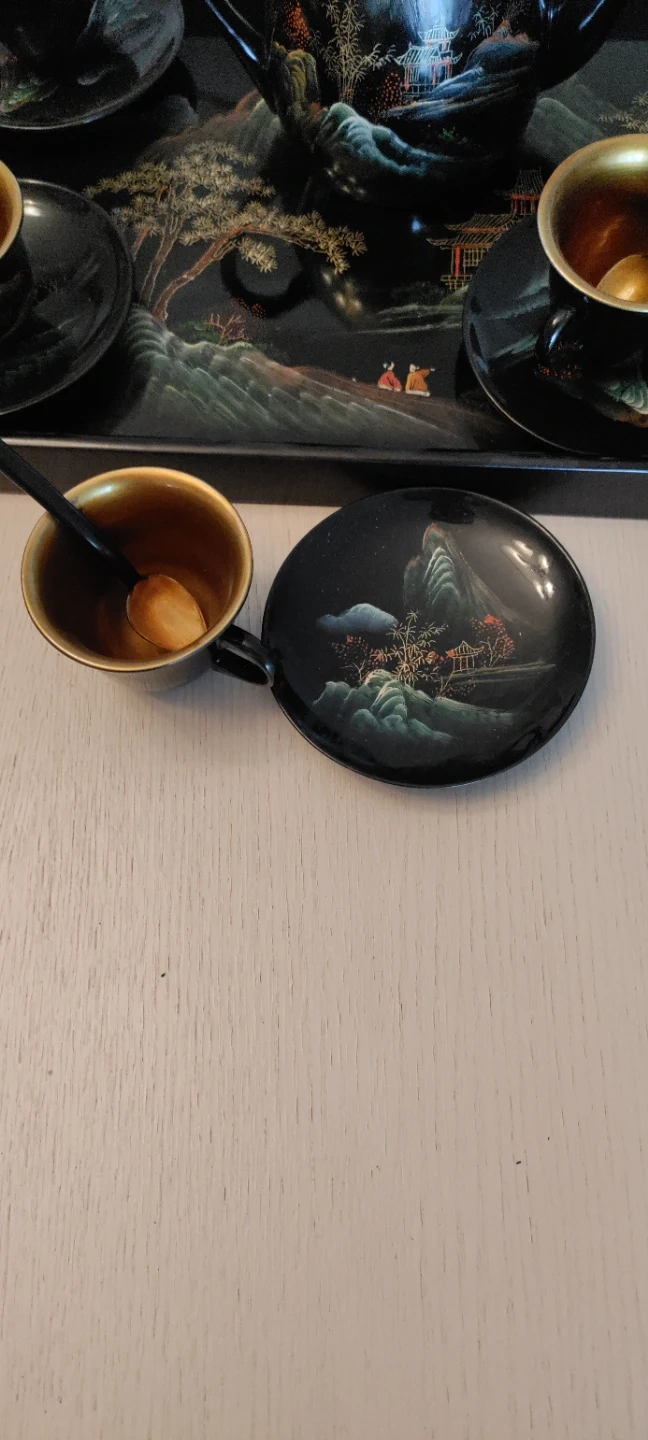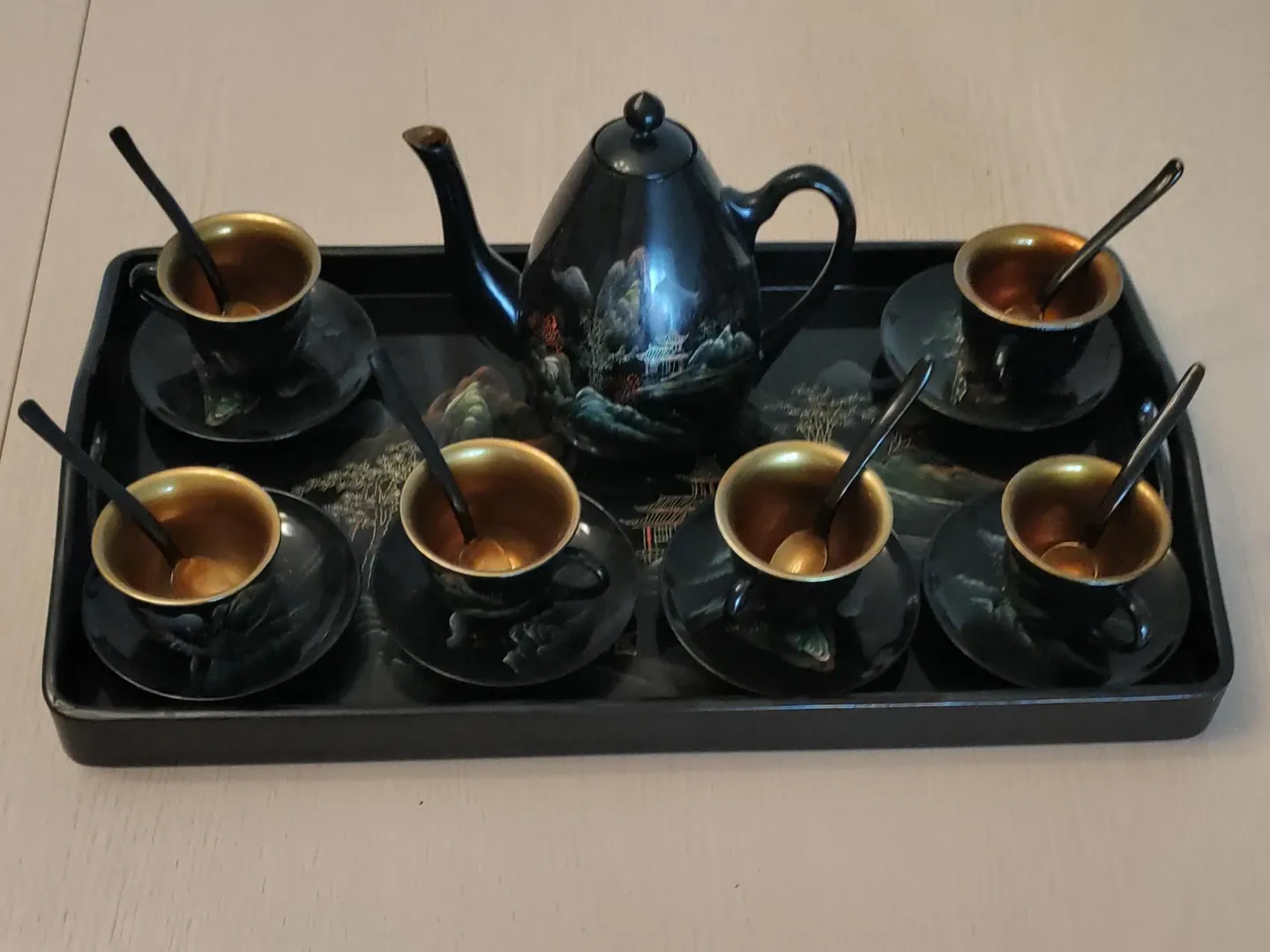 This vintage decorative Japanese wooden tea set includes a teapot, six cups, six saucers, a tray, and six spoons. The pieces are black with a decorative scenic landscape design. The cups and saucers have a gold-toned interior. Have two sets, willing to sell both at a discount