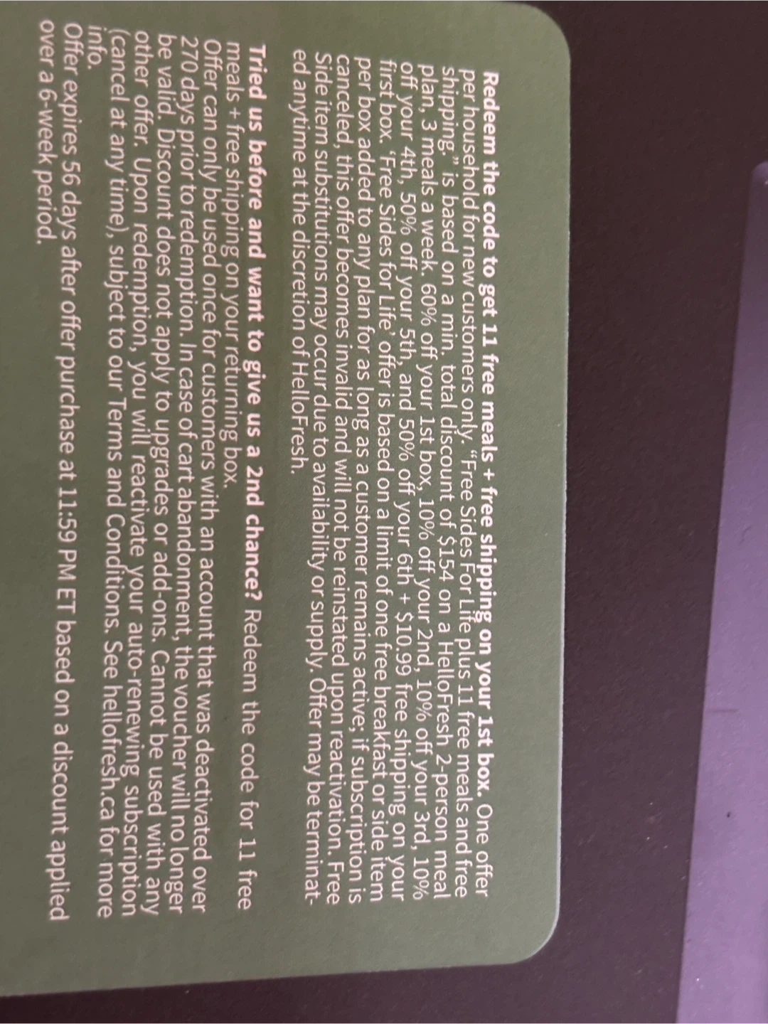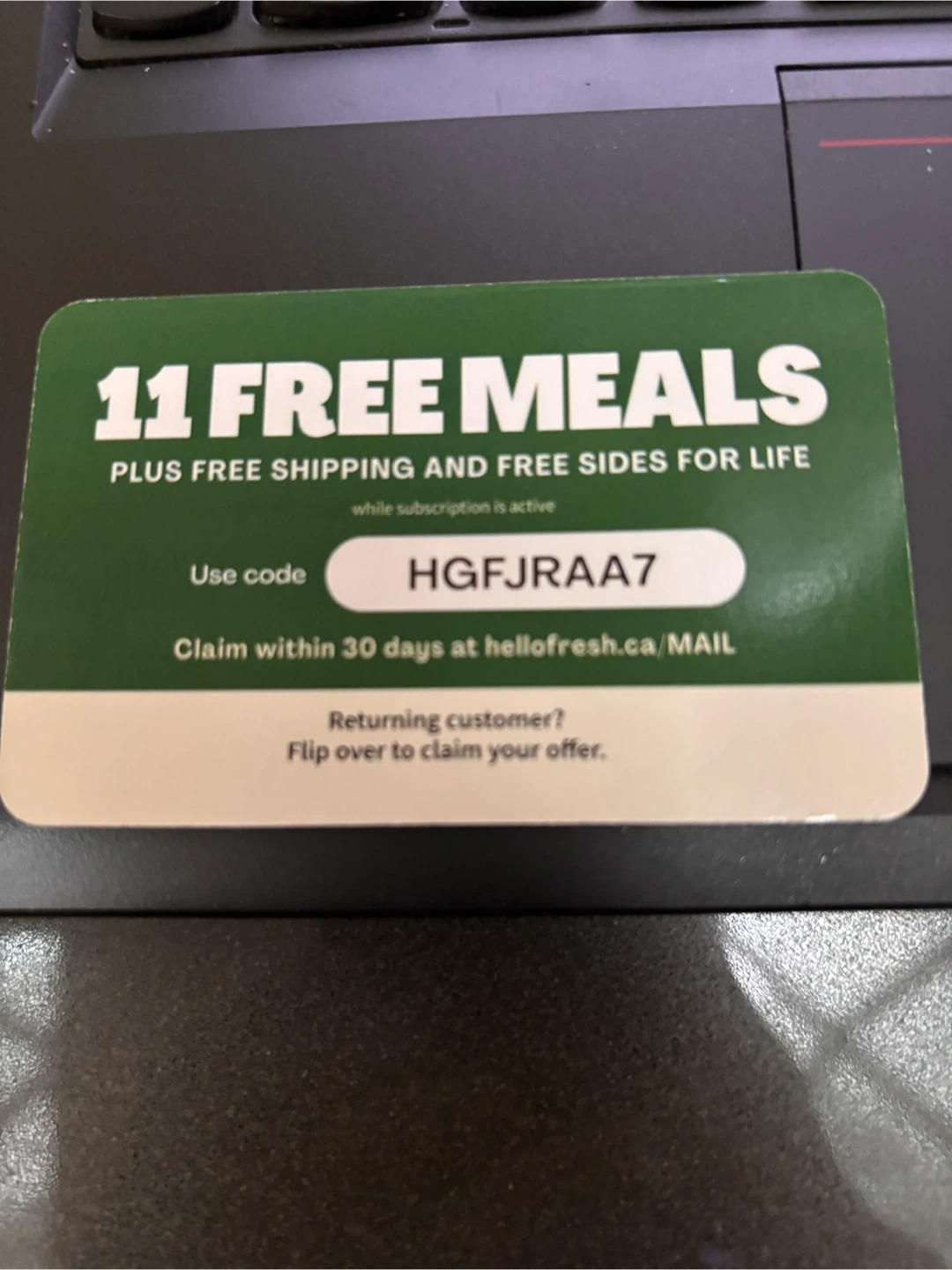 This voucher offers 11 free meals and free shipping on your first box from HelloFresh. It also includes free sides for life, valid while your subscription is active. To claim, use code HGFJRAA7 at hellofresh.ca