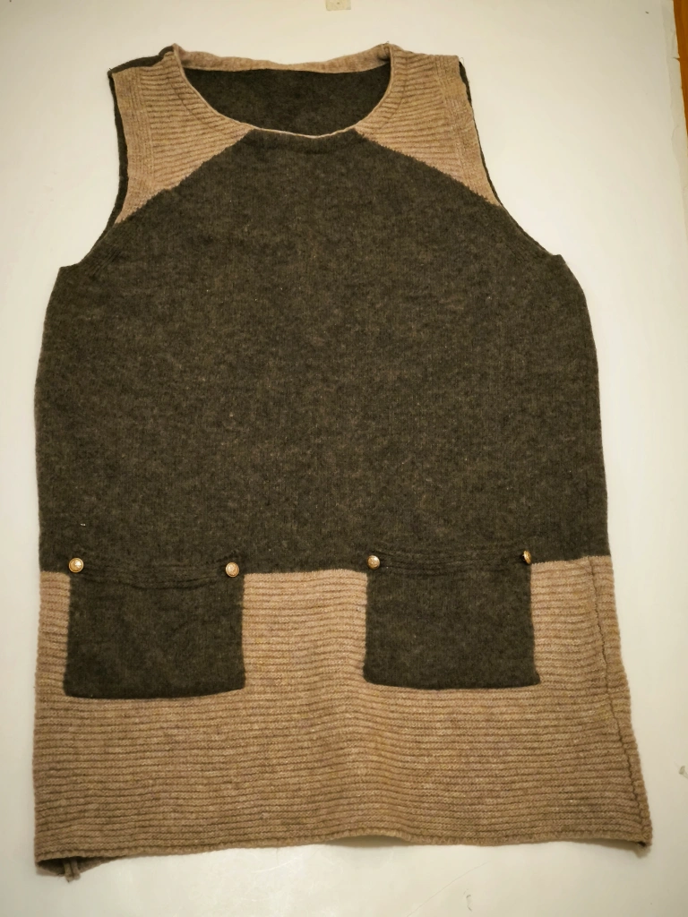 Women's sleeveless top in beige and brown knit. Features two front pockets and a round neckline.