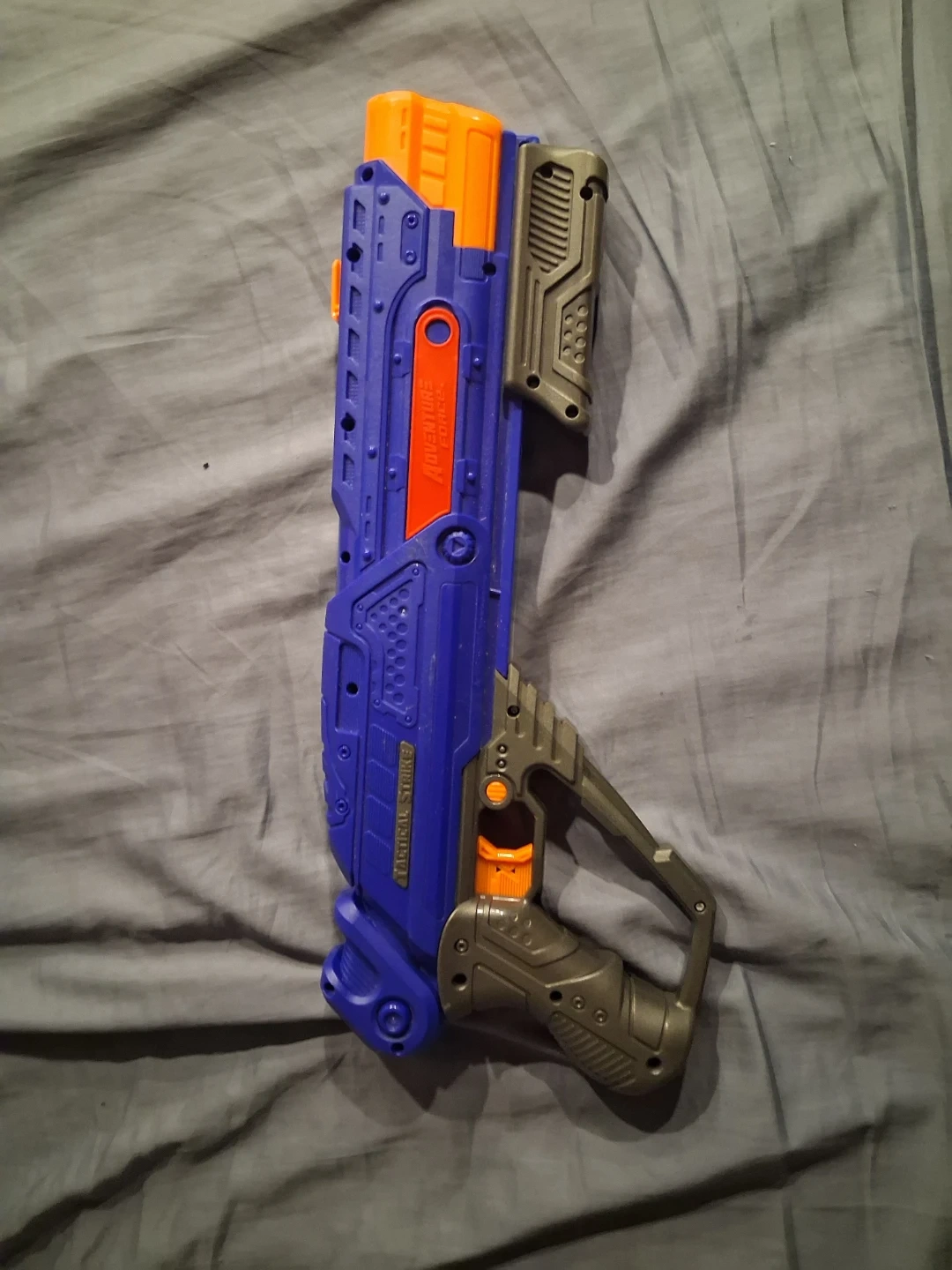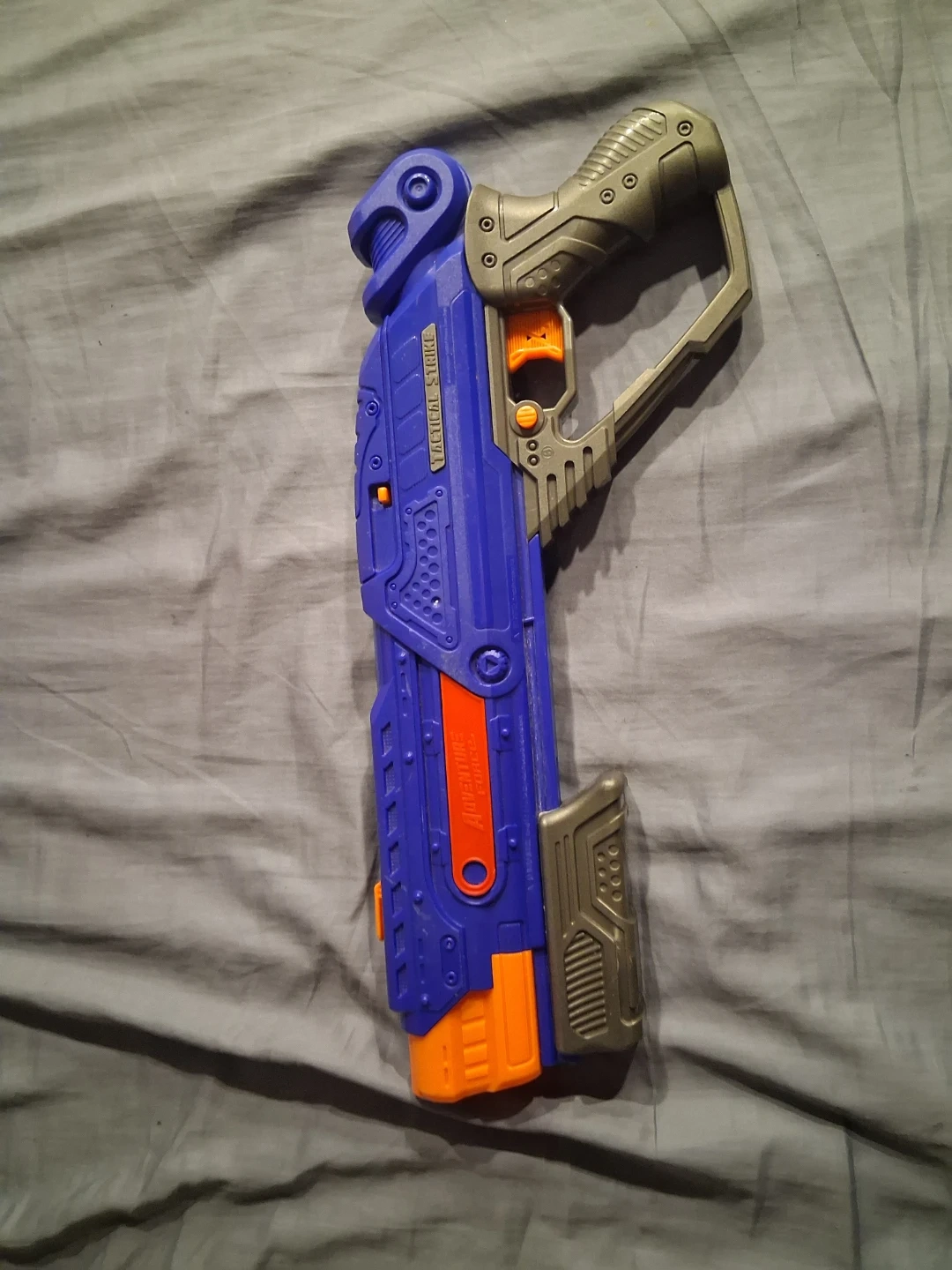 This blue and orange Adventure Force Tactical Strike blaster is ready for action! It features a realistic design with textured grips and tactical rails. A fun toy for outdoor play! Missing the ammo holder