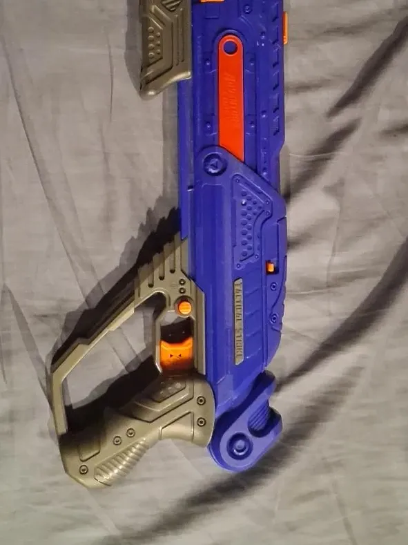 This blue and orange Adventure Force Tactical Strike blaster is ready for action! It features a realistic design with textured grips and tactical rails. A fun toy for outdoor play! Missing the ammo holder