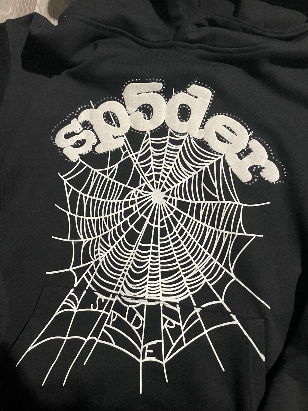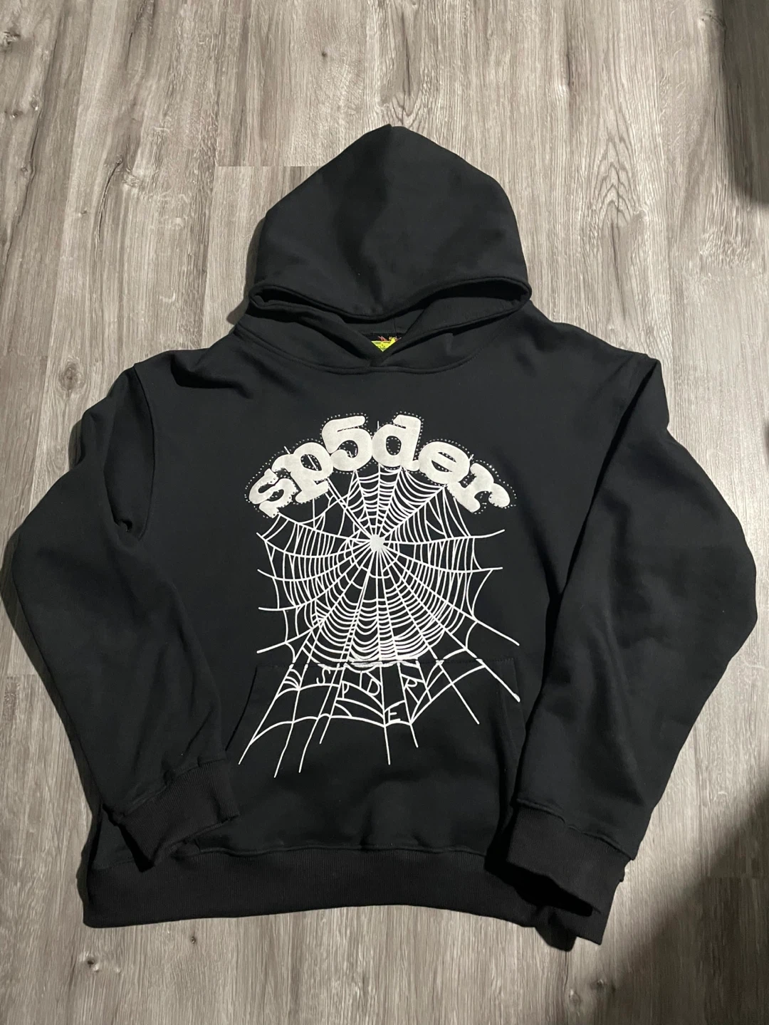 Selling a Sp5der hoodie in black! It's a size medium and made of 100% cotton. It features a spiderweb design on the front. Machine wash cold, tumble dry low. Do not bleach or iron. Pick Up Only
