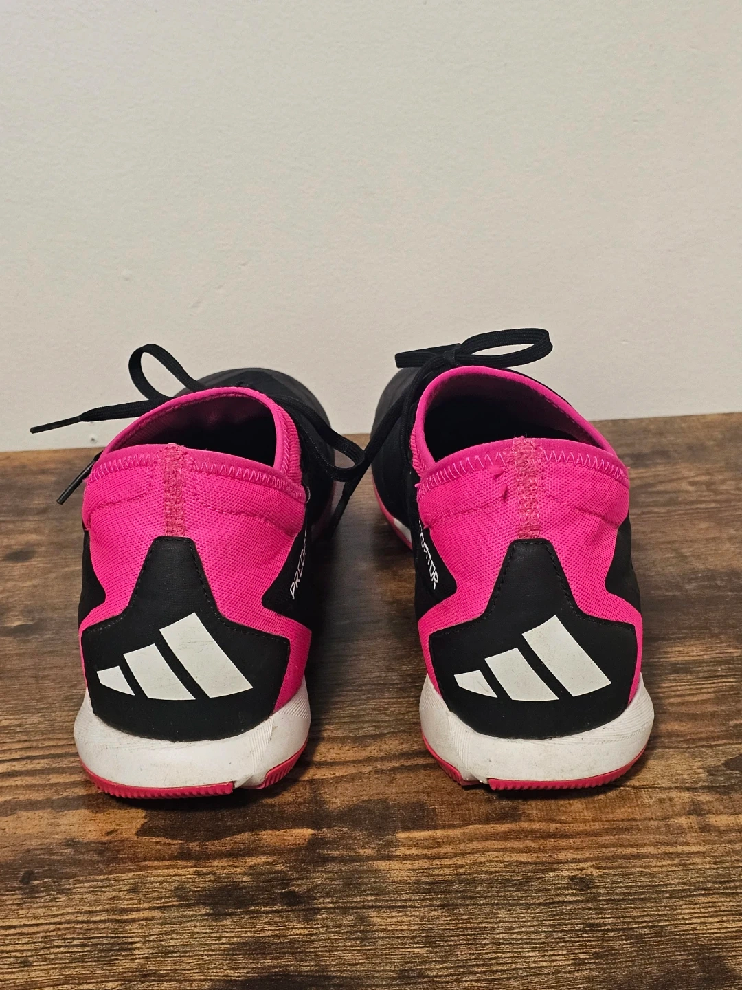 These Adidas Predator 20.3 indoor soccer shoes are black and pink. They feature a laceless design with a supportive mid-cut collar. Great for playing soccer indoors!