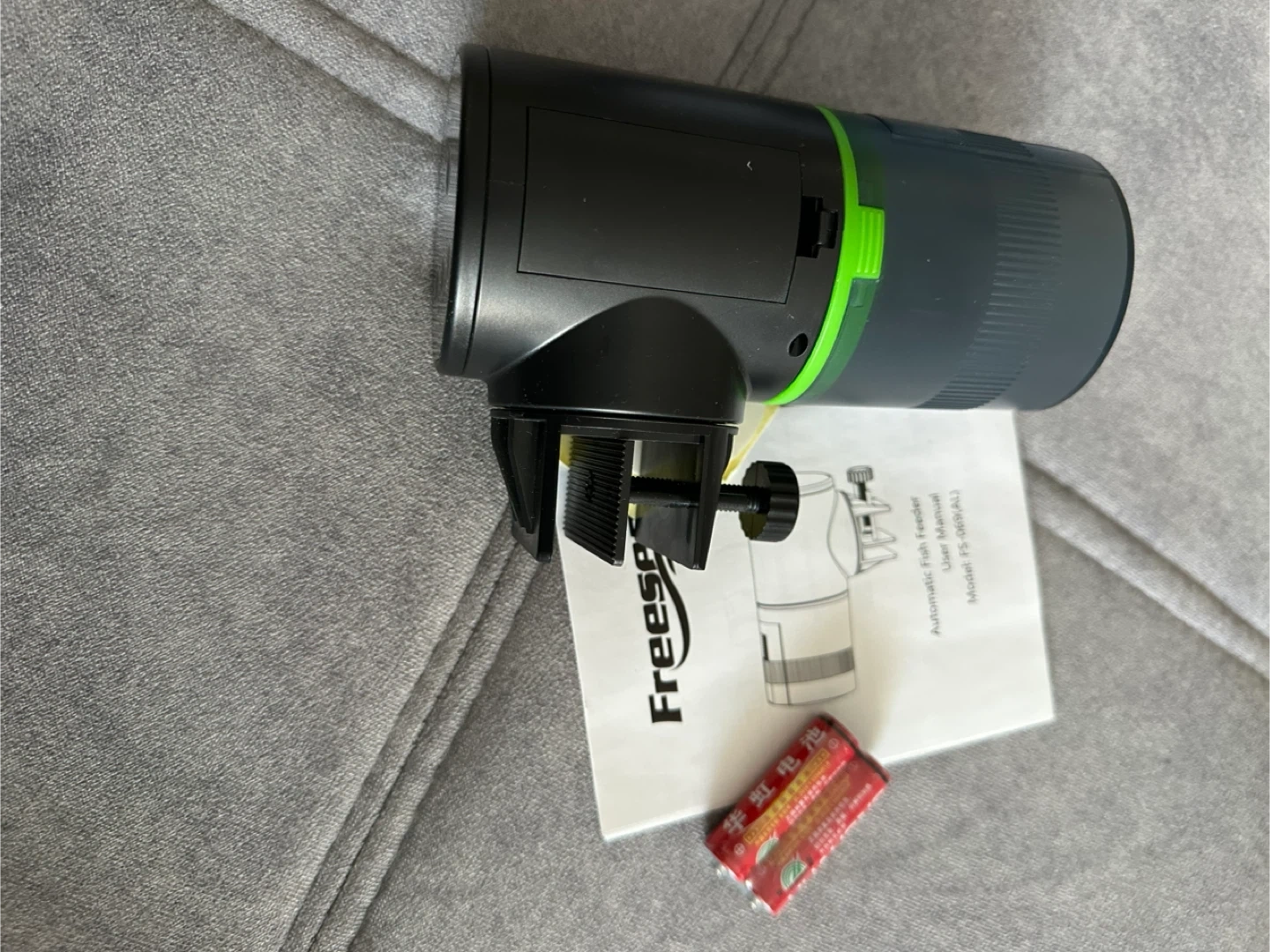 This is a Freesea automatic fish feeder with a 200ml capacity. It features intelligent feeding, silent running, and energy saving. The feeder has an adjustable feeding amount and a moisture-proof design. It includes batteries and a user manual.