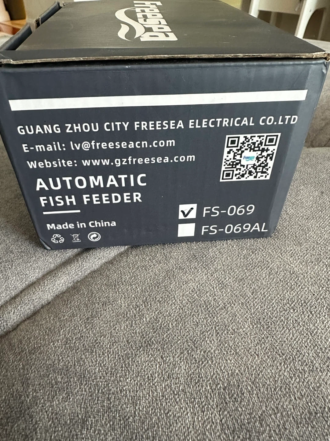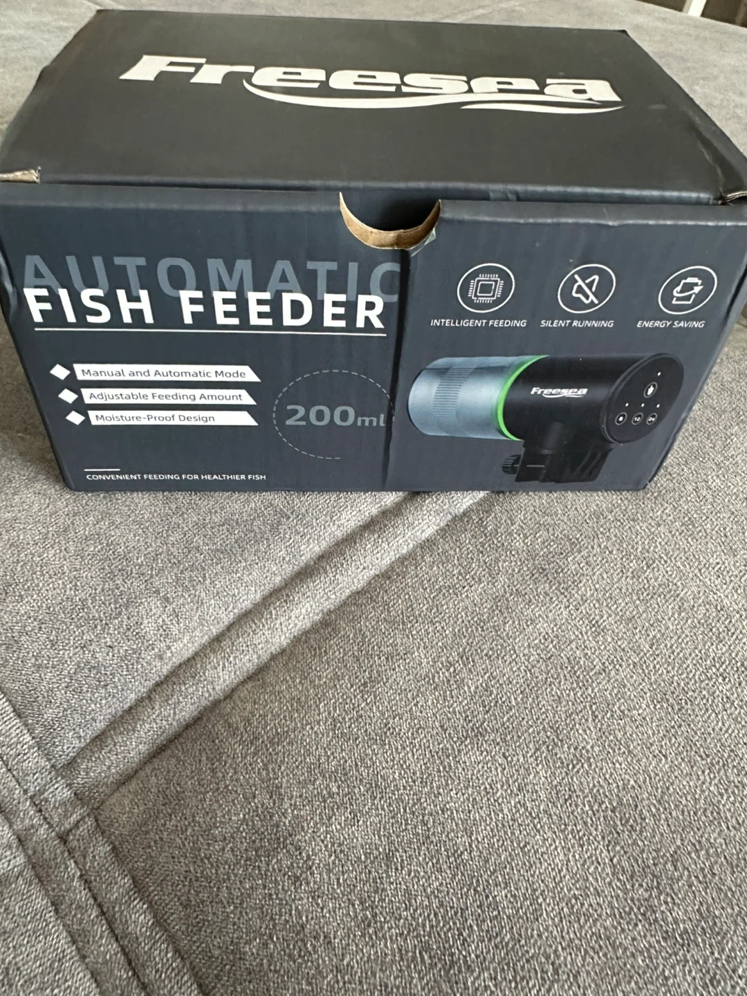 This is a Freesea automatic fish feeder with a 200ml capacity. It features intelligent feeding, silent running, and energy saving. The feeder has an adjustable feeding amount and a moisture-proof design. It includes batteries and a user manual.