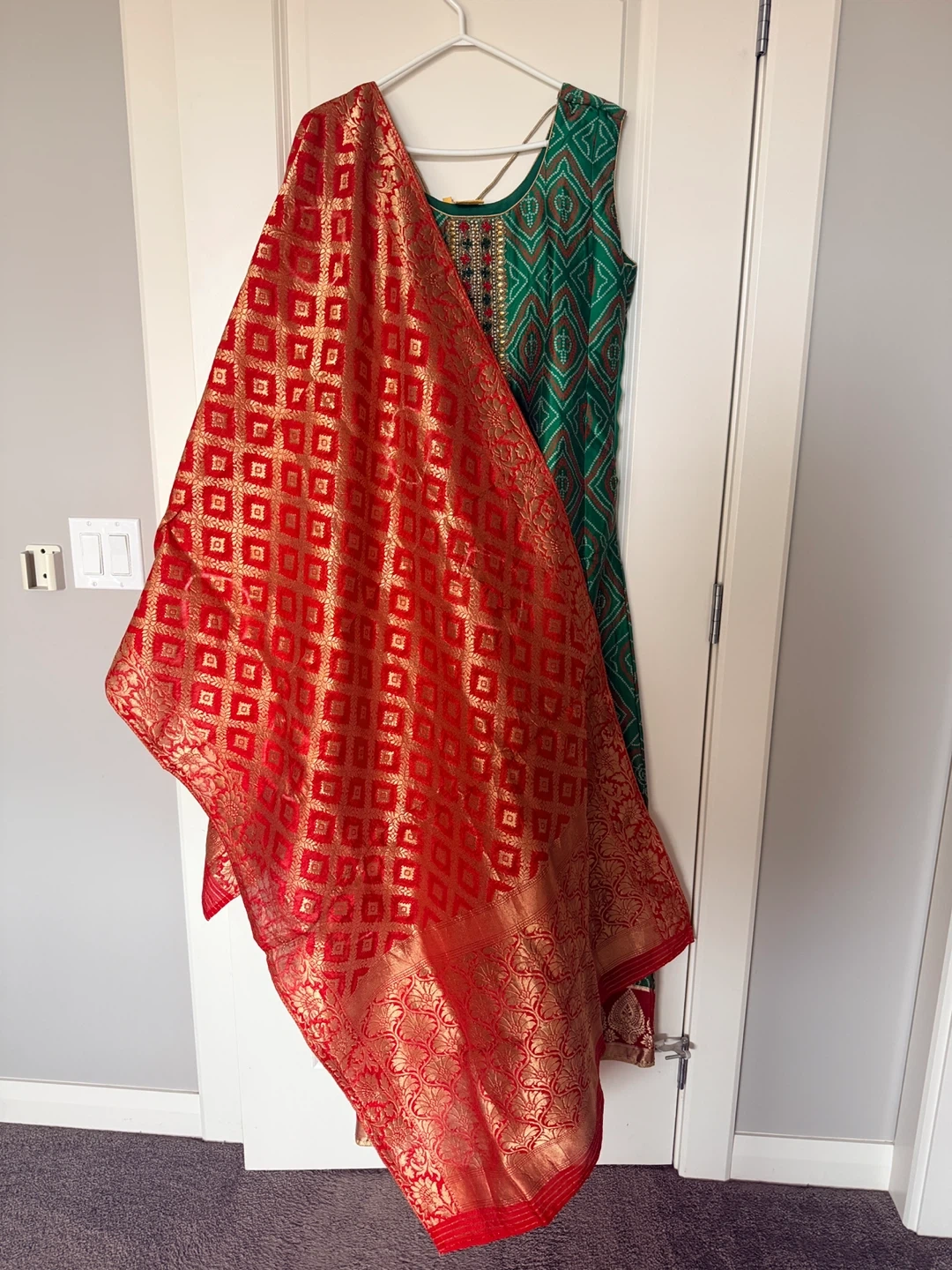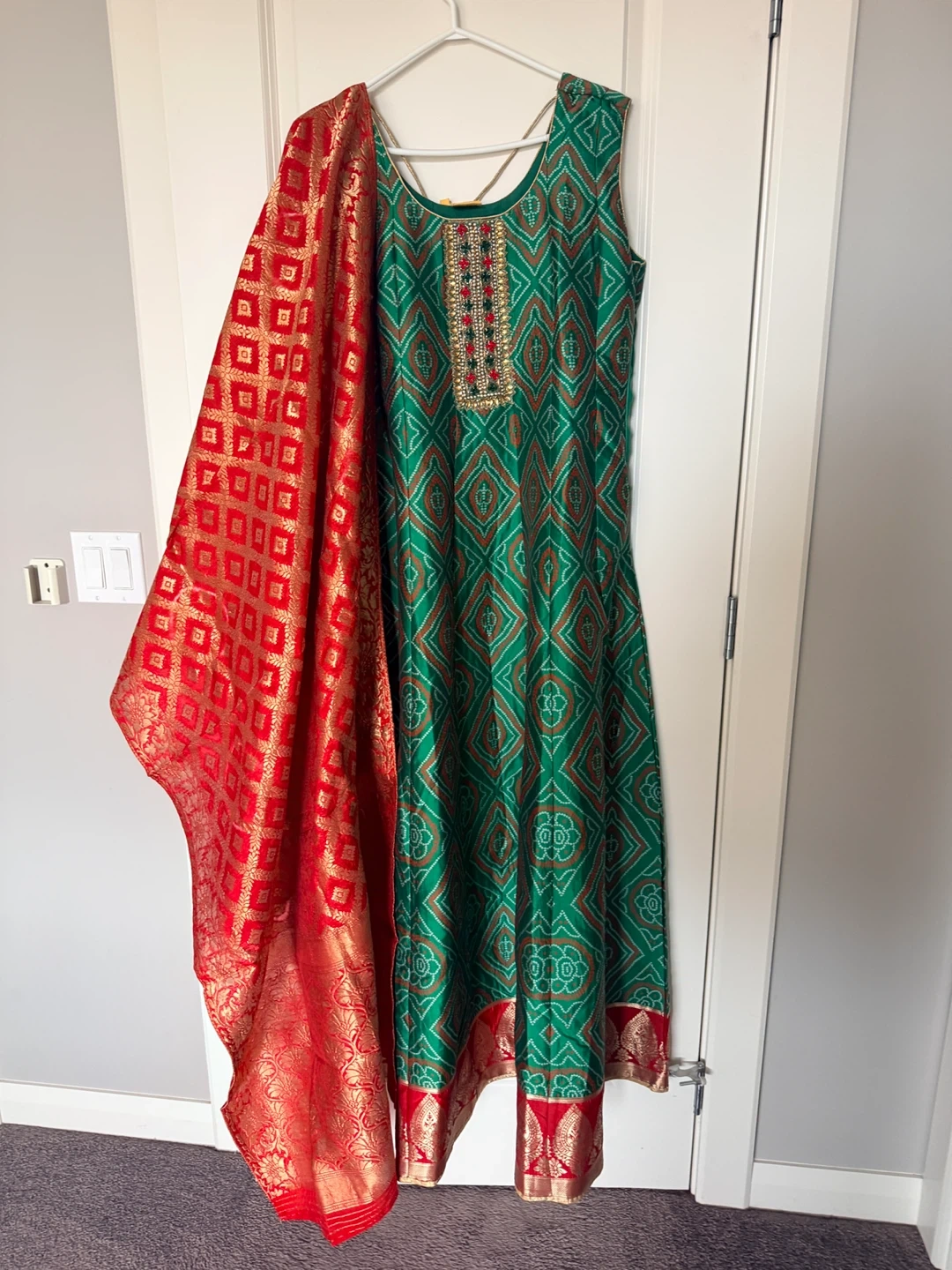 Beautiful green Indian dress with a contrasting vibrant red. This is perfect for cultural events or festive occasions!