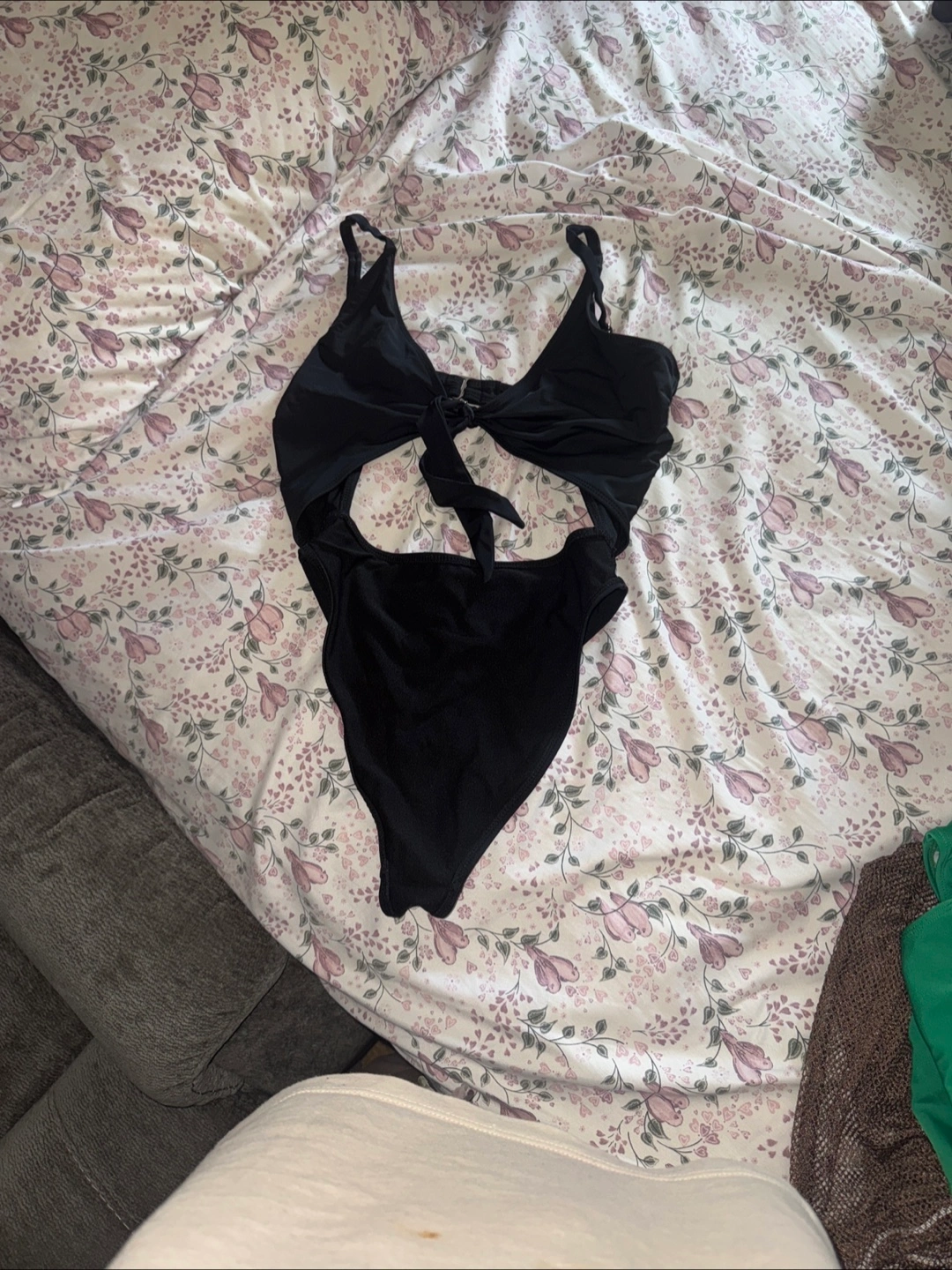 Black one-piece swimsuit with a knot detail at the bust and cutouts on the sides. Ribbed fabric. Spaghetti straps.