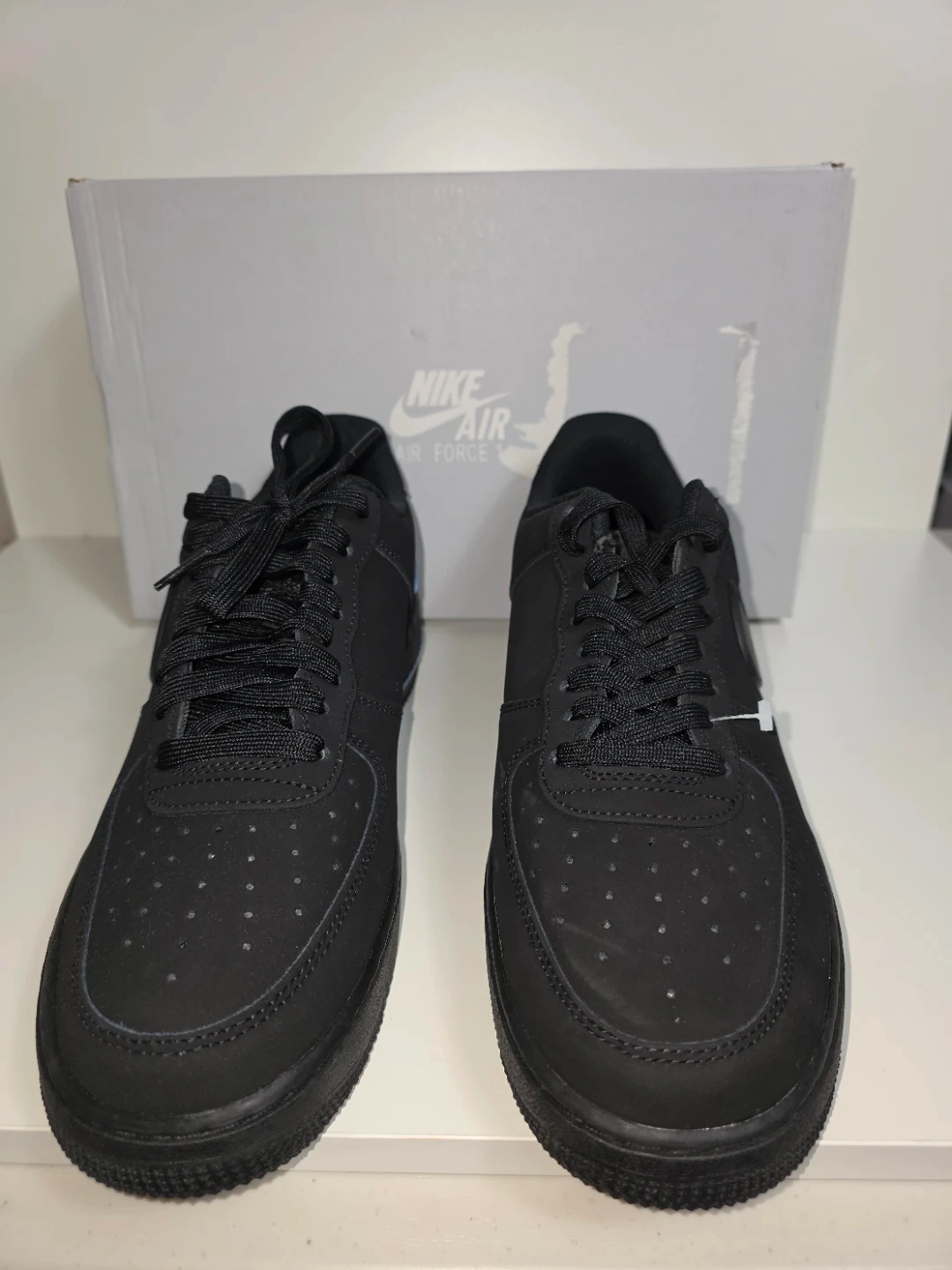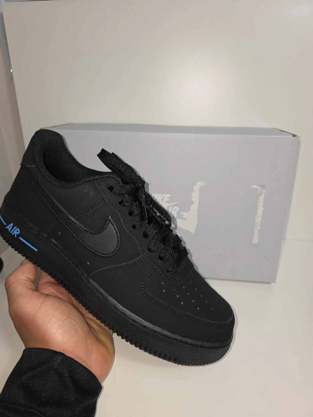 These are black Nike Air Force 1 Low sneakers with blue accents. They feature the classic Air Force 1 silhouette and come with their original box. These kicks are perfect for everyday wear.