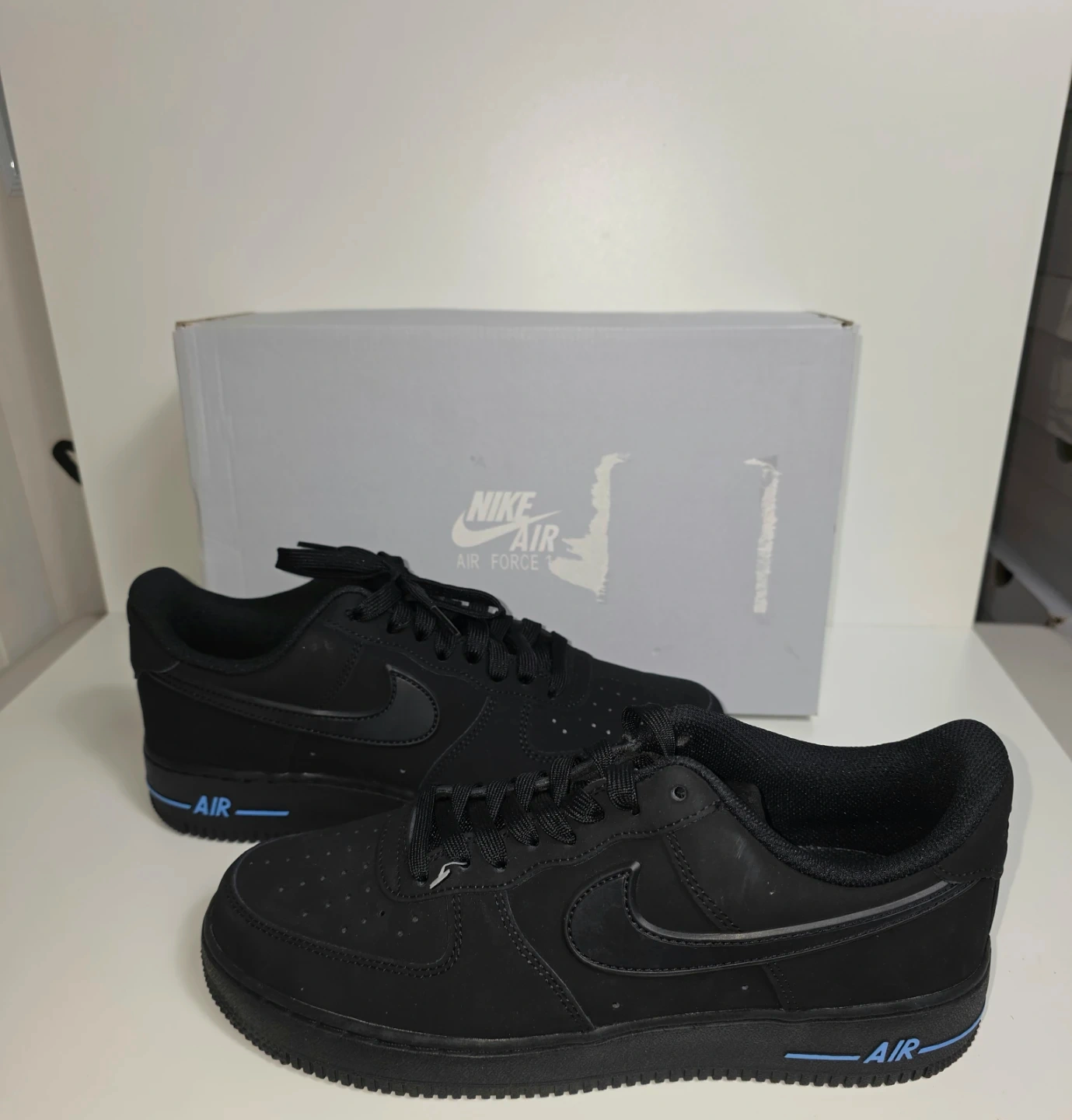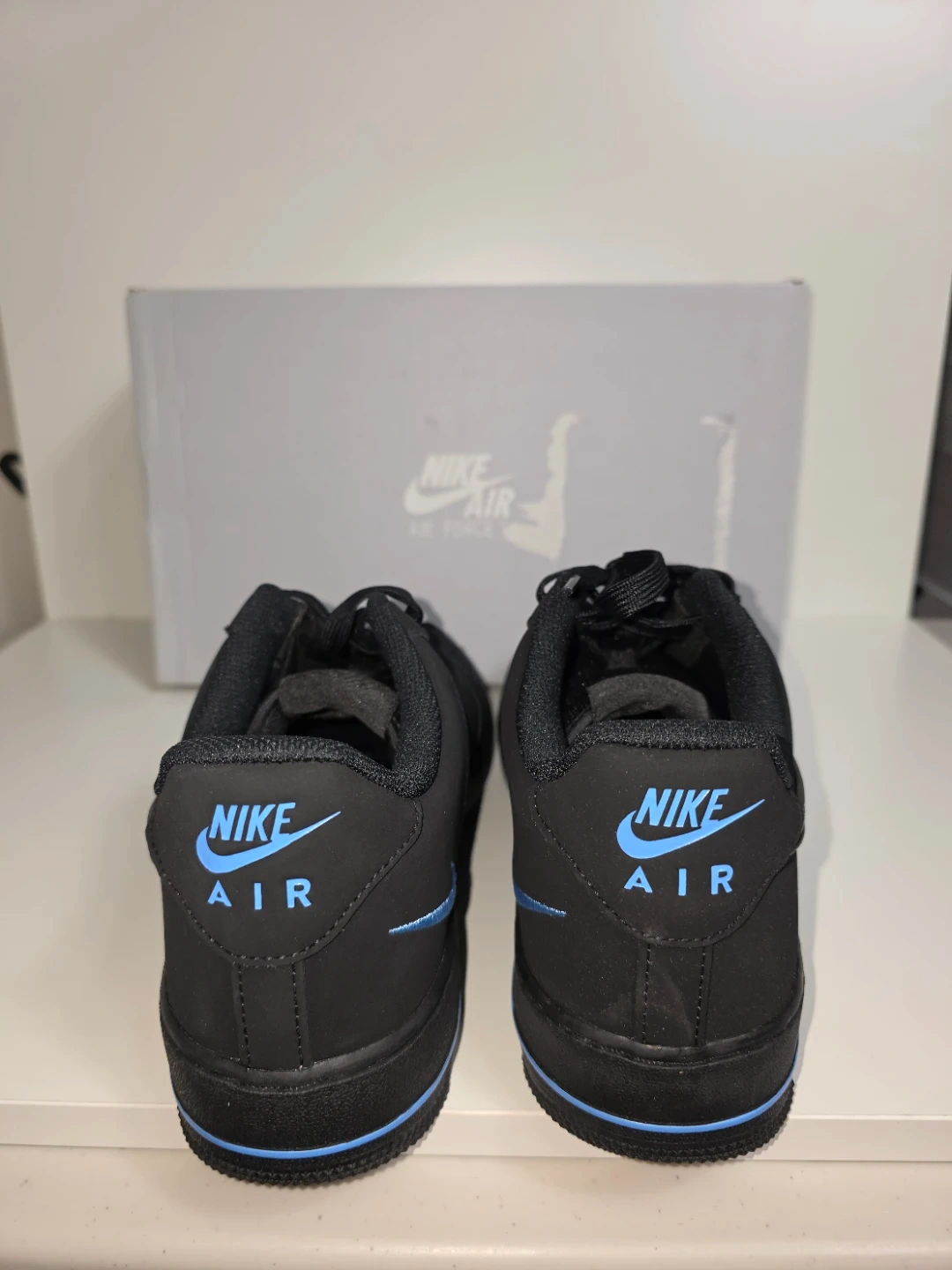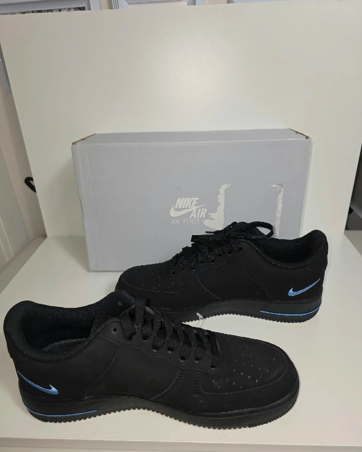 These are black Nike Air Force 1 Low sneakers with blue accents. They feature the classic Air Force 1 silhouette and come with their original box. These kicks are perfect for everyday wear.