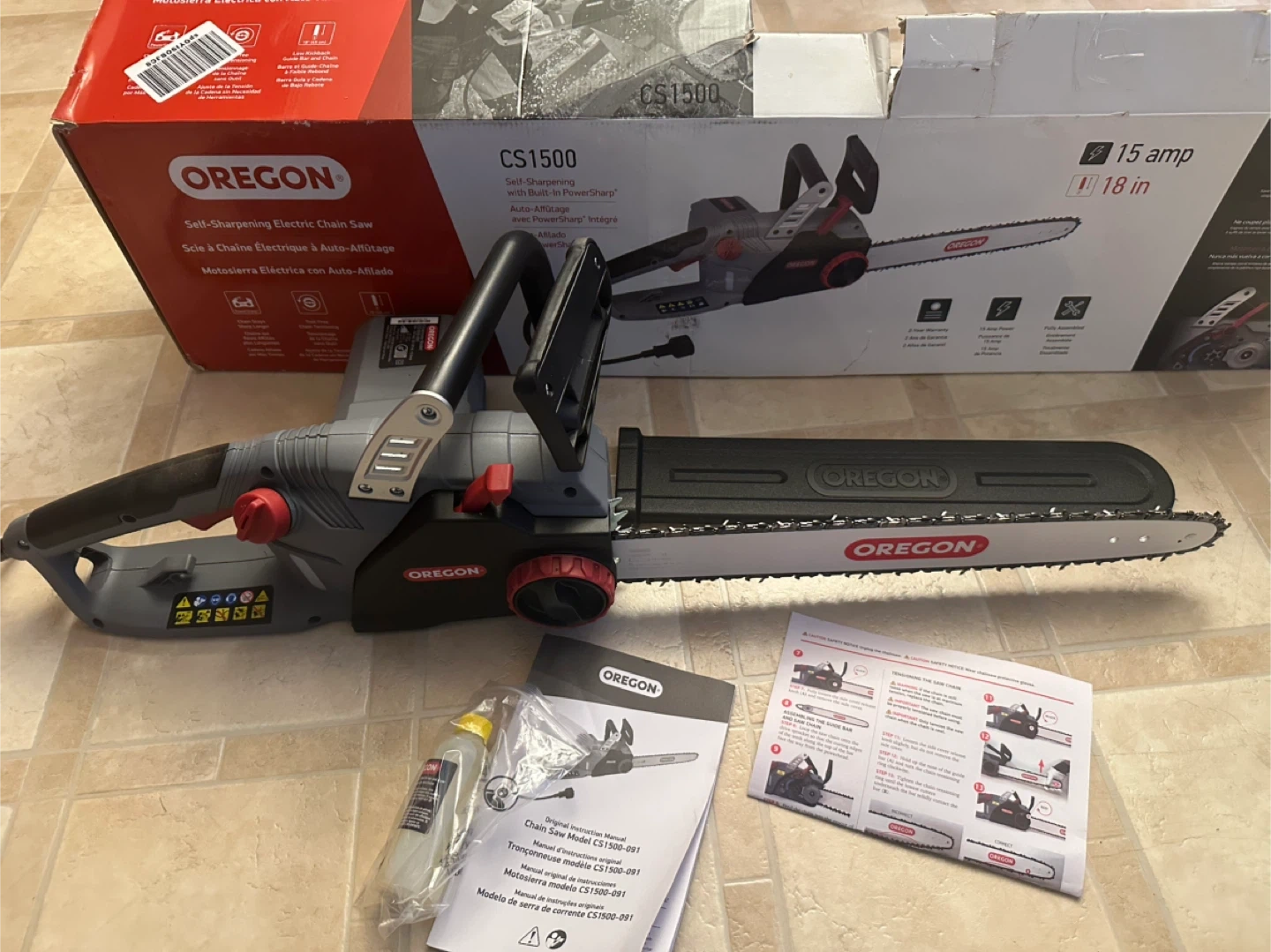 This Oregon CS1500 is a self-sharpening electric chainsaw. It features a 15 amp motor and an 18-inch bar. It comes with a bottle of chain oil and an instruction manual.