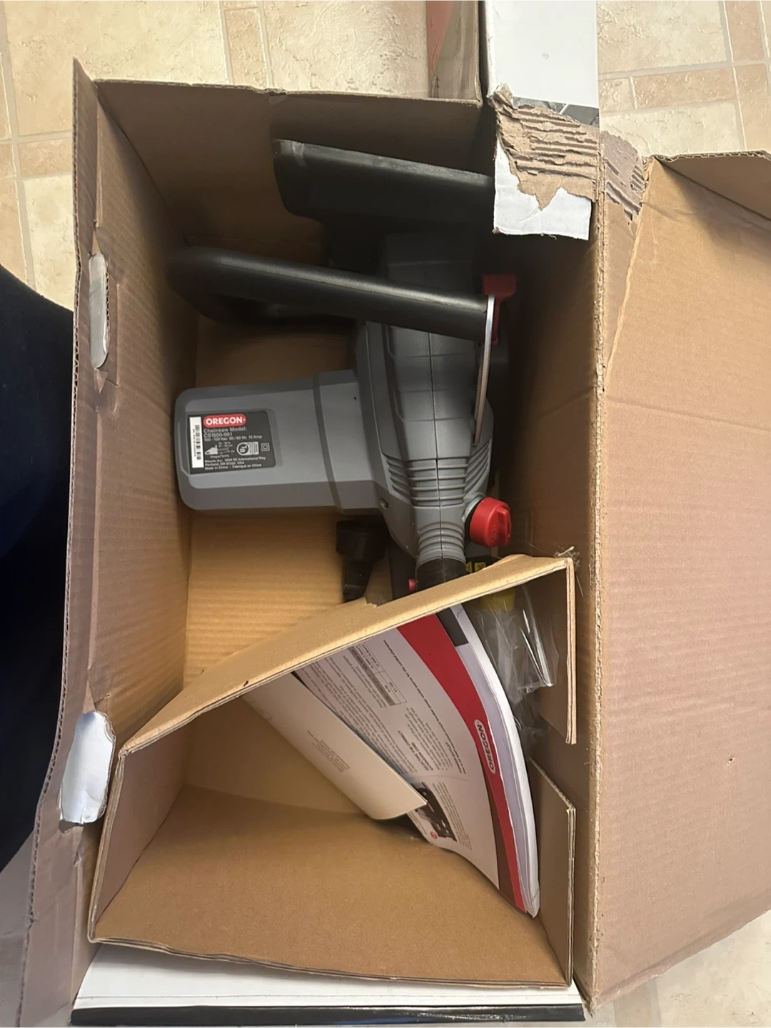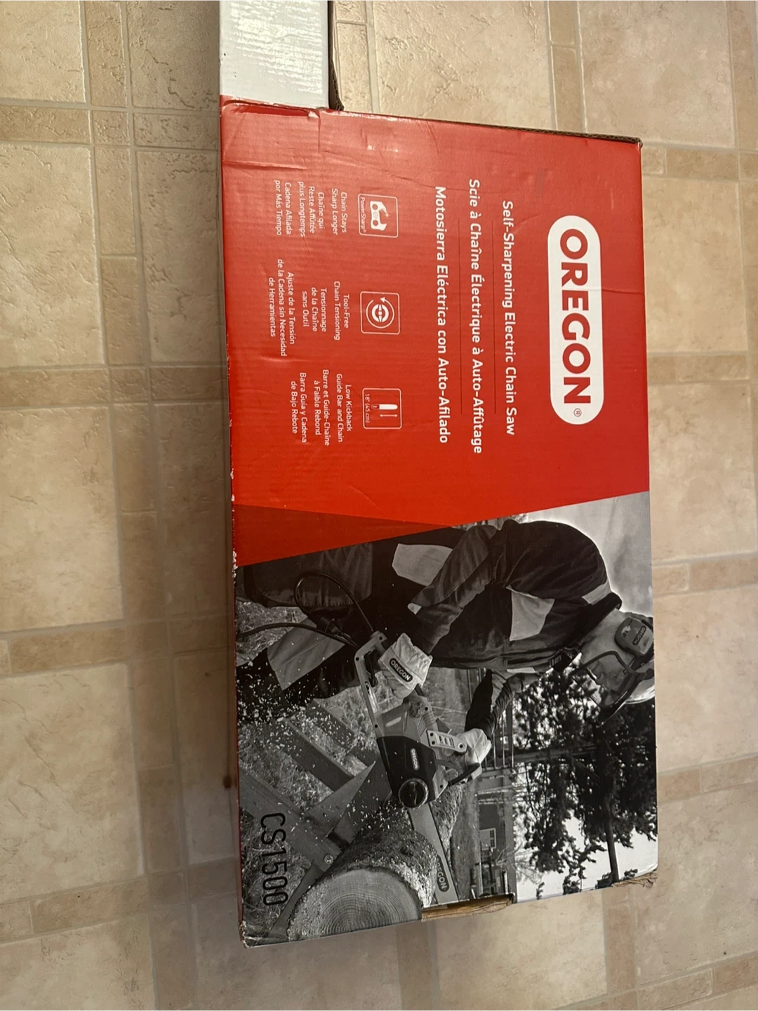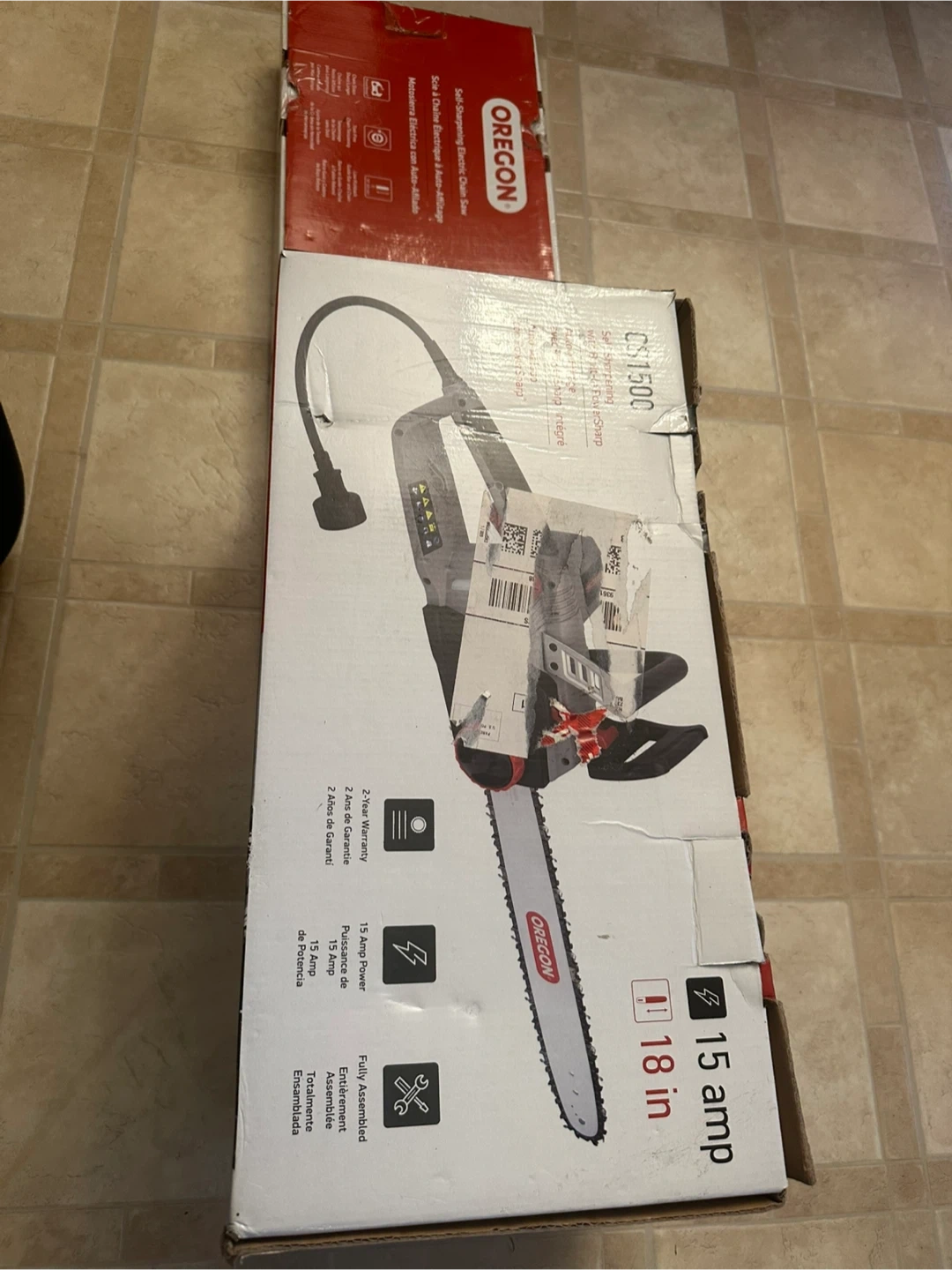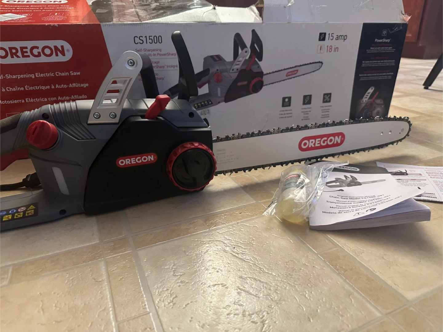 This Oregon CS1500 is a self-sharpening electric chainsaw. It features a 15 amp motor and an 18-inch bar. It comes with a bottle of chain oil and an instruction manual.