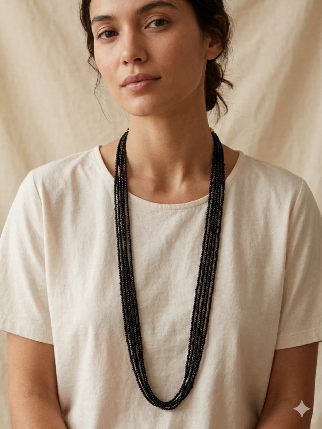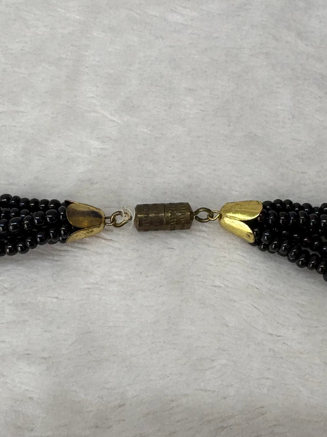 This beautiful 1980s era necklace features multiple strands of tiny black seed beads, creating a rich and textured look. The long length allows for versatile styling, finished with a secure brass-tone barrel clasp and decorative end caps. Perfect for layering or wearing as a bold solo statement piece.