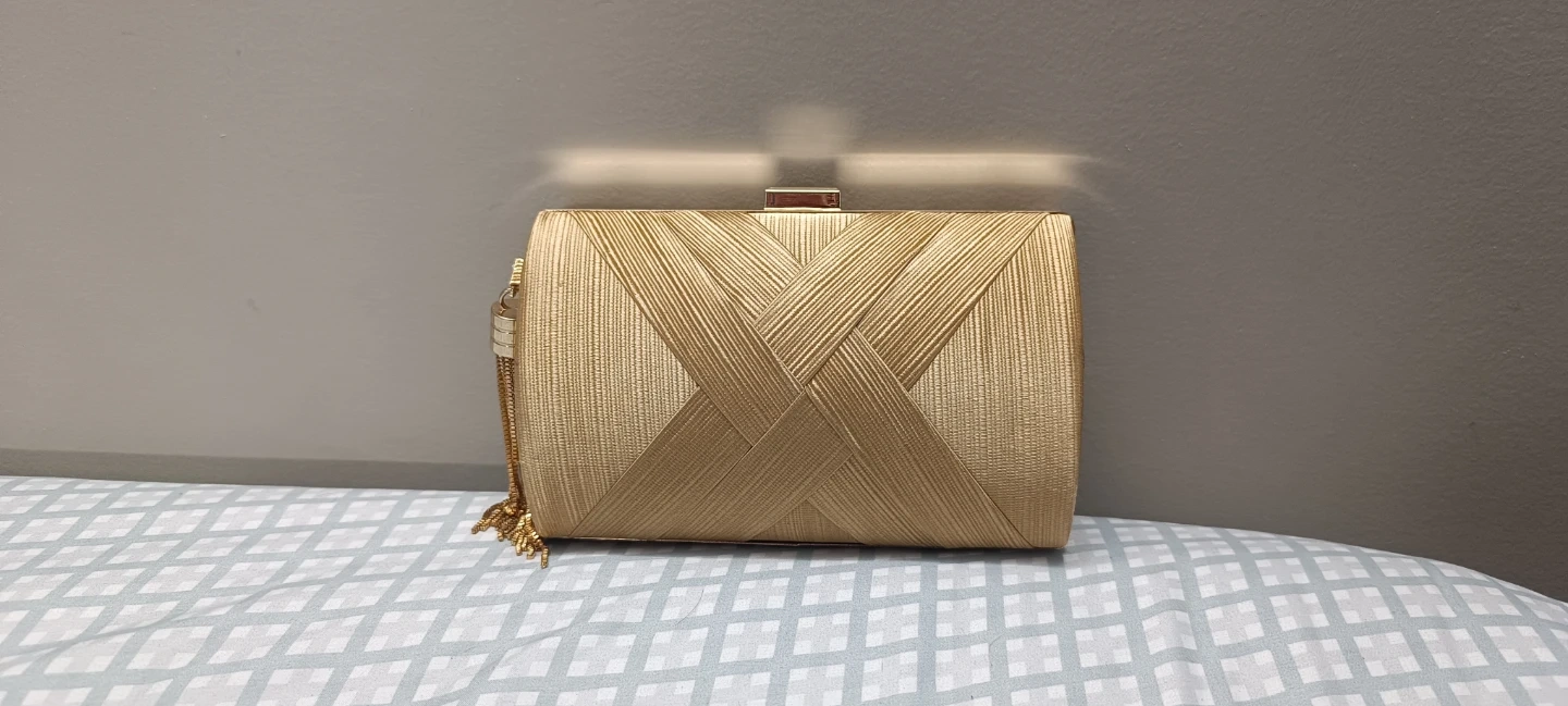 This is a lovely gold clutch bag, perfect for special occasions. It features a textured woven design and a delicate chain strap. The interior is lined and has a small pocket.