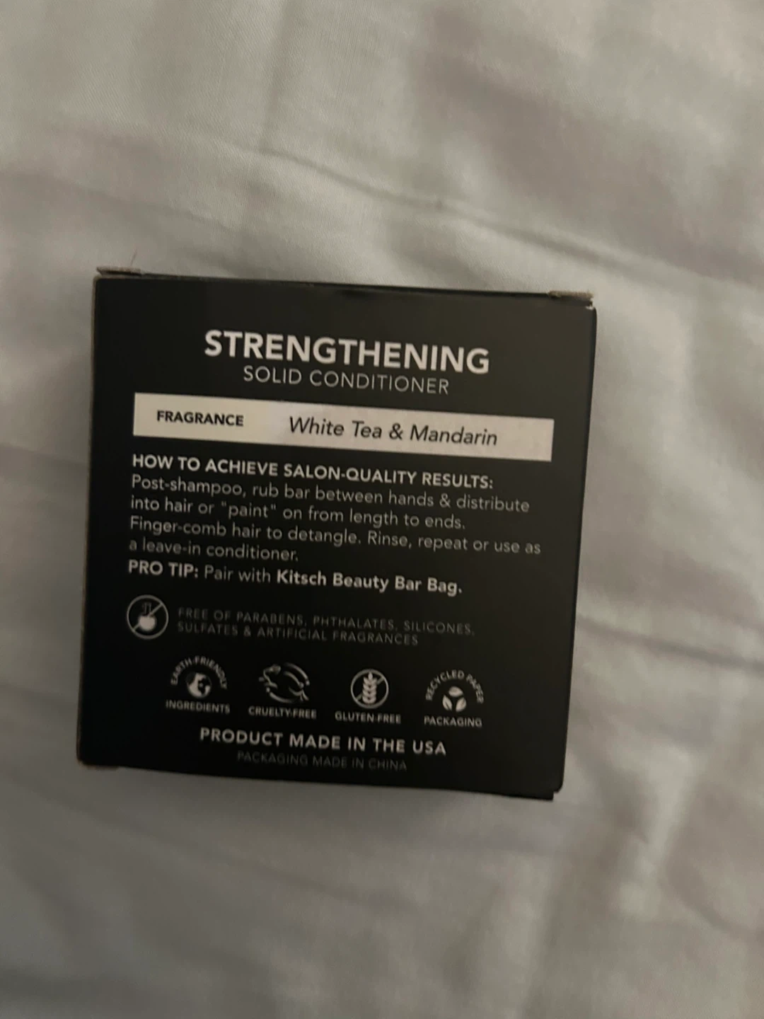 I'm selling a Kitsch Strengthening Solid Conditioner, Rice Water Protein. It's for healthier-looking hair and is colour safe and vegan. It's also free of parabens, phthalates, silicones, sulfates and artificial fragrances.